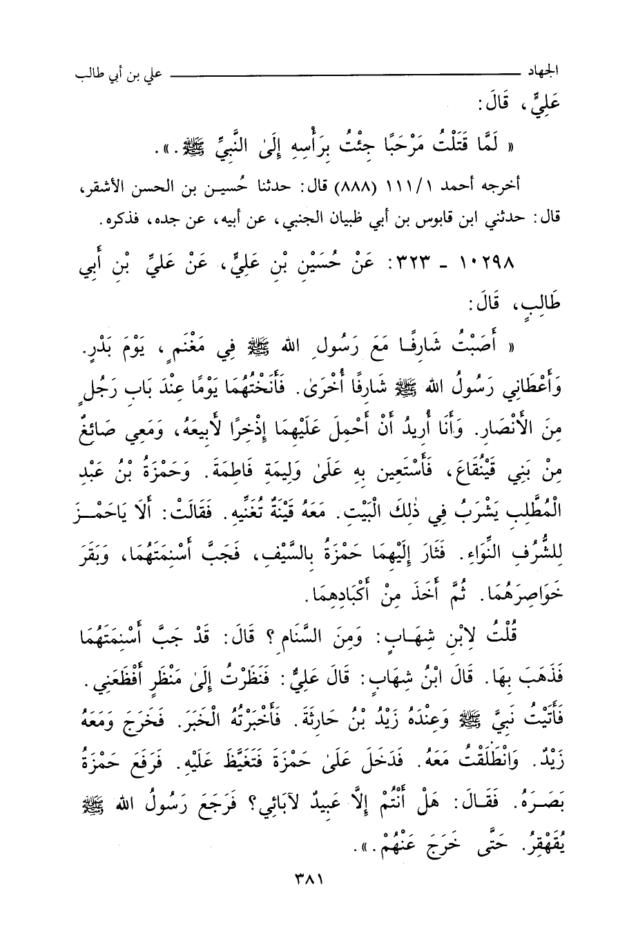 كَانَتْ لِي شَارِفٌ مِنْ نَصِيبِي مِنَ الْمَغْنَمِ يَوْمَ بَدْرٍ، وَكَانَ النَّبِيُّ صلى الله عليه وسلم أَعْطَانِي شَارِفًا مِنَ الْخُمُسِ، فَلَمَّا أَرَدْتُ أَنْ أَبْتَنِيَ بِفَاطِمَةَ بِنْتِ رَسُولِ اللَّهِ صلى الله عليه وسلم، وَاعَدْتُ رَجُلاً صَوَّاغًا، مِنْ بَنِي قَيْنُقَاعَ، أَنْ يَرْتَحِلَ مَعِيَ، فَنَأْتِيَ بِإِذْخِرٍ، أَرَدْتُ أَنْ أَبِيعَهُ الصَّوَّاغِينَ، وَأَسْتَعِينَ بِهِ فِي وَلِيمَةِ عُرْسِي، فَبَيْنَا أَنَا أَجْمَعُ لِشَارِفَيَّ مَتَاعًا مِنَ الأَقْتَابِ وَالْغَرَائِرِ وَالْحِبَالِ، وَشَارِفَايَ مُنَاخَانِ إِلَى جَنْبِ حُجْرَةِ رَجُلٍ مِنَ الأَنْصَارِ، رَجَعْتُ حِينَ جَمَعْتُ مَا جَمَعْتُ، فَإِذَا شَارِفَايَ قَدِ اجْتُبَّ أَسْنِمَتُهُمَا، وَبُقِرَتْ خَوَاصِرُهُمَا، وَأُخِذَ مِنْ أَكْبَادِهِمَا، فَلَمْ أَمْلِكْ عَيْنَيَّ حِينَ رَأَيْتُ ذَلِكَ الْمَنْظَرَ مِنْهُمَا، فَقُلْتُ: مَنْ فَعَلَ هَذَا؟ فَقَالُوا: فَعَلَ حَمْزَةُ بْنُ عَبْدِ الْمُطَّلِبِ، وَهْوَ فِي هَذَا الْبَيْتِ، فِى شَرْبٍ مِنَ الأَنْصَارِ، فَانْطَلَقْتُ حَتَّى أَدْخُلَ عَلَى النَّبِيِّ صلى الله عليه وسلم، وَعِنْدَهُ زَيْدُ بْنُ حَارِثَةَ، فَعَرَفَ النَّبِيُّ صلى الله عليه وسلم فِي وَجْهِي الَّذِي لَقِيتُ، فَقَالَ النَّبِيُّ صلى الله عليه وسلم: مَا لَكَ؟ فَقُلْتُ: يَا رَسُولَ اللَّهَ، مَا رَأَيْتُ كَالْيَوْمِ قَطُّ، عَدَا حَمْزَةُ عَلَى نَاقَتَيَّ، فَأَجَبَّ أَسْنِمَتَهُمَا، وَبَقَرَ خَوَاصِرَهُمَا، وَهَا هُوَ ذَا فِي بَيْتٍ مَعَهُ شَرْبٌ، فَدَعَا النَّبِيُّ صلى الله عليه وسلم بِرِدَائِهِ، فَارْتَدَى، ثُمَّ انْطَلَقَ يَمْشِي، وَاتَّبَعْتُهُ أَنَا وَزَيْدُ بْنُ حَارِثَةَ، حَتَّى جَاءَ الْبَيْتَ الَّذِي