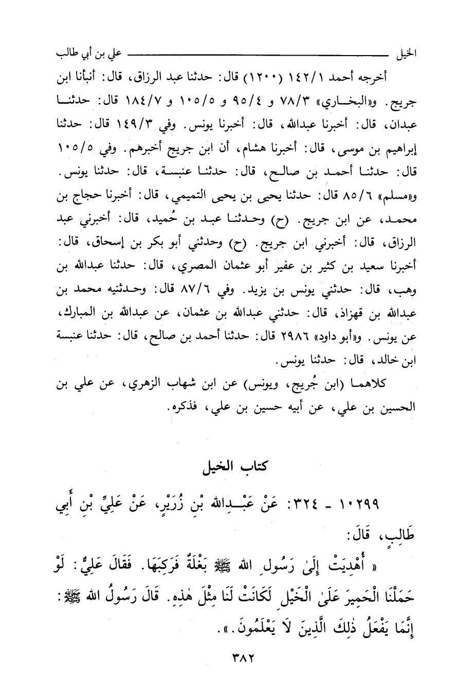 - وفي رواية: أُهْدِيَتْ إِلَى رَسُولِ اللهِ صلى الله عليه وسلم بَغْلَةٌ، فَرَكِبَهَا، فَقَالَ عَلِيٌّ: لَوْ حَمَلْنَا الْحَمِيرَ عَلَى الْخَيْلِ لَكَانَتْ لَنَا مِثْلَ هَذِهِ، قَالَ رَسُولُ اللهِ صلى الله عليه وسلم: إِنَّمَا يَفْعَلُ ذَلِكَ الَّذِينَ لَا يَعْلَمُونَ.