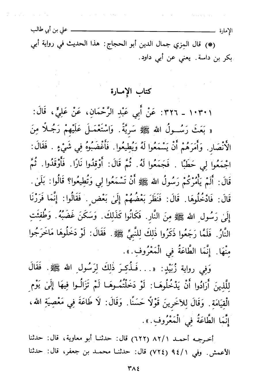 - وفي رواية: أَنَّ رَسُولَ اللَّهِ صلى الله عليه وسلم بَعَثَ جَيْشًا، وَأَمَّرَ عَلَيْهِمْ رَجُلاً، فَأَوْقَدَ نَارًا، فَقَالَ: ادْخُلُوهَا، فَأَرَادَ نَاسٌ أَنْ يَدْخُلُوهَا، وَقَالَ آخَرُونَ: إِنَّمَا فَرَرْنَا مِنْهَا، فَذُكِرَ ذَلِكَ لِرَسُولِ اللَّهِ صلى الله عليه وسلم، فَقَالَ لِلَّذِينَ أَرَادُوا أَنْ يَدْخُلُوهَا: لَوْ دَخَلْتُمُوهَا لَمْ تَزَالُوا فِيهَا إِلَى يَوْمِ الْقِيَامَةِ، وَقَالَ لِلآخَرِينَ قَوْلاً حَسَنًا، وَقَالَ: لَا طَاعَةَ فِي مَعْصِيَةِ اللَّهِ، إِنَّمَا الطَّاعَةُ فِي الْمَعْرُوفِ.