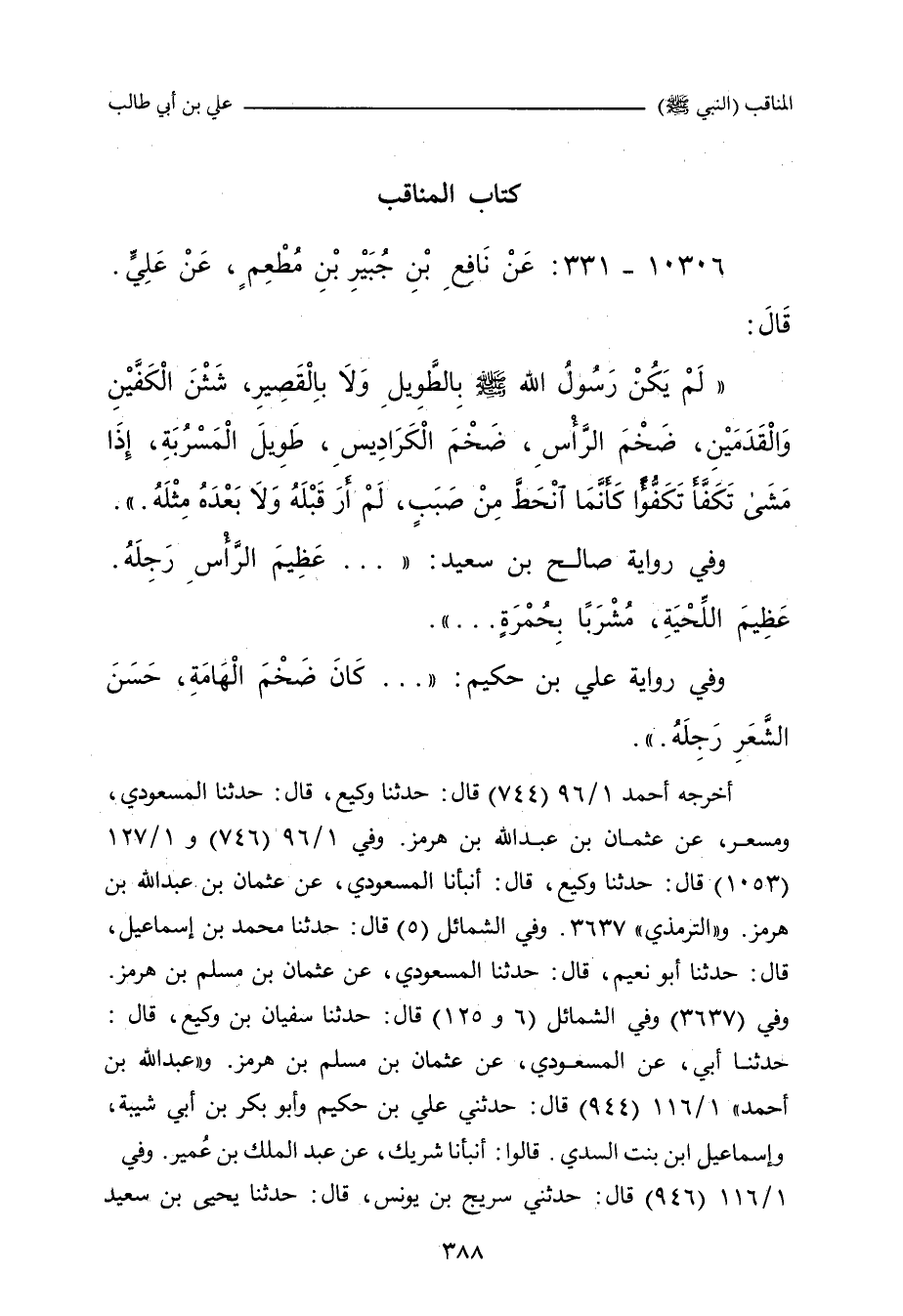 - وفي رواية: عَنْ عَلِيِّ بْنِ أَبِي طَالِبٍ، أَنَّهُ وَصَفَ النَّبِيَّ صلى الله عليه وسلم، فَقَالَ: كَانَ عَظِيمَ الْهَامَةِ، أَبْيَضَ، مُشْرَبًا بِحُمْرَةٍ، عَظِيمَ اللِّحْيَةِ، ضَخْمَ الْكَرَادِيسِ، شَثْنَ الْكَفَّيْنِ وَالْقَدَمَيْنِ، طَوِيلَ الْمَسْرُبَةِ، كَثِيرَ شَعَرِ الرَّأْسِ رَجِلَهُ، يَتَكَفَّأُ فِي مِشْيَتِهِ، كَأَنَّمَا يَنْحَدِرُ فِي صَبَبٍ، لَا طَوِيلٌ، وَلَا قَصِيرٌ، لَمْ أَرَ مِثْلَهُ قَبْلَهُ، وَلَا بَعْدَهُ صلى الله عليه وسلم.