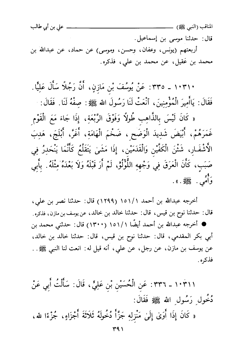 وفي ١/ ١٥١ (١٣٠١) قال عَبْد الله بن أحمد: حدَّثني مُحَمد بن أَبي بَكْر المُقَدَّمِي، حدَّثنا نُوح بن قَيْس، حدَّثنا خالد بن خالد , عن يُوسُف بن مازن , عن رجلٍ , عَنْ عَلِيٍّ، أَنَّهُ قِيلَ لَهُ: انْعَتْ لَنَا النَّبِيَّ صلى الله عليه وسلم، فَقَالَ: