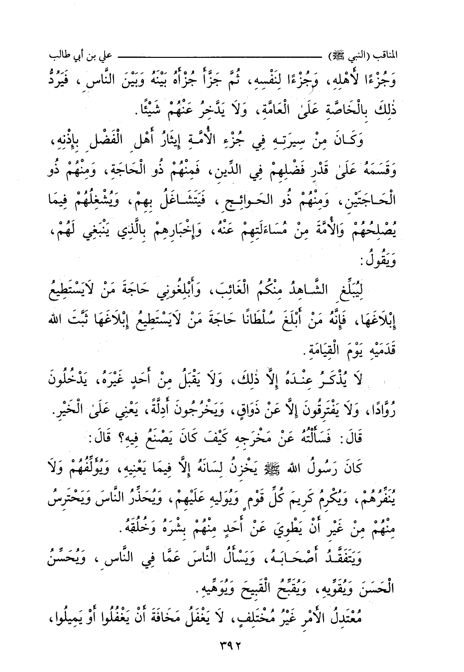 وَجُزْءًا لأَهْلِهِ، وَجُزْءًا لِنَفْسِهِ، ثُمَّ جَزَّأَ جُزْأَهُ بَيْنَهُ وَبَيْنَ النَّاسِ، فَيَرُدُّ ذَلِكَ عَلَى الْعَامَّةِ بِالْخَاصَّةِ، وَلَا يَدَّخِرُ عَنْهُمْ شَيْئًا، وَكَانَ مِنْ سِيرَتِهِ فِي جُزْءِ الأُمَّةِ إِيثَارُ أَهْلِ الْفَضْلِ نَادِيَهُ، وَقَسْمُهُ عَلَى قَدْرِ فَضْلِهِمْ فِي الدِّينِ، فَمِنْهُمْ ذُو الْحَاجَةِ، وَمِنْهُمْ ذُو الْحَاجَتَيْنِ، وَمِنْهُمْ ذُو الحَوَائِجِ، فَيَتَشَاغَلُ بِهِمْ، وَيَشْغَلَهُمْ فِيمَا أَصْلَحُهُمْ وَالأُمَّةَ مِنْ مُسَاءَلَتِهِمْ عَنْهُ، وَإِخْبَارِهِمْ بِالَّذِي يَنْبَغِي لَهُمْ، وَيَقُولُ: لِيُبَلِّغِ الشَّاهِدُ الْغَائِبَ، وَأَبْلِغُونِي حَاجَةَ مَنْ لَا يَسْتَطِيعُ إِبْلَاغِي حَاجَتَهُ، فَإِنَّهُ مَنْ أَبْلَغَ سُلْطَانًا حَاجَةَ مَنْ لَا يَسْتَطِيعُ إِبْلَاغَهَا إياه، ثَبَّتَ اللَّهُ قَدَمَيْهِ يَوْمَ الْقِيَامَةِ، لَا يُذْكَرُ عِنْدَهُ إِلَاّ ذَلِكَ، وَلَا يَقْبَلُ مِنْ أَحَدٍ غَيْرَهُ، يَدْخُلُونَ رُوَّادًا، وَلَا يَفْتَرِقُونَ إِلَاّ عَنْ ذَوَاقٍ، وَيَخْرُجُونَ أَدِلَّةً.