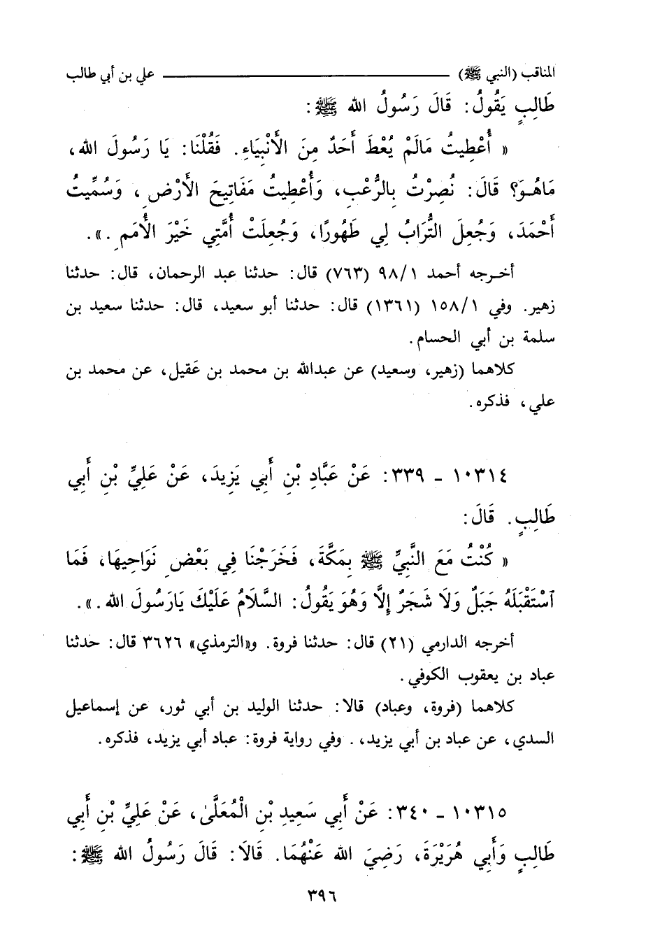 - لفظ ابن أَبي الحُسَام: أُعْطِيتُ أَرْبَعًا، لَمْ يُعْطَهُنَّ أَحَدٌ مِنْ أَنْبِيَاءِ اللهِ: أُعْطِيتُ مَفَاتِيحَ الأَرْضِ، وَسُمِّيتُ أَحْمَدَ، وَجُعِلَ التُّرَابُ لِي طَهُورًا، وَجُعِلَتْ أُمَّتِي خَيْرَ الأُمَمِ. حم (١٣٦٢)