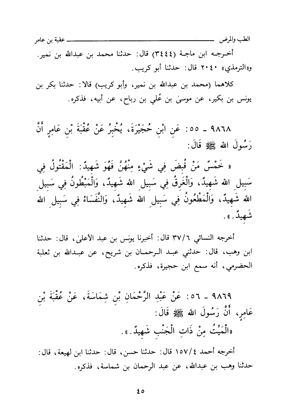 ٩٨٦٩ - عَنْ عَبْدِ الرَّحْمَانِ بْنِ شَِمَاسَةَ، عَنْ عُقْبَةَ بْنِ عَامِرٍ، أَنَّ رَسُولَ اللهِ صلى الله عليه وسلم قَالَ: