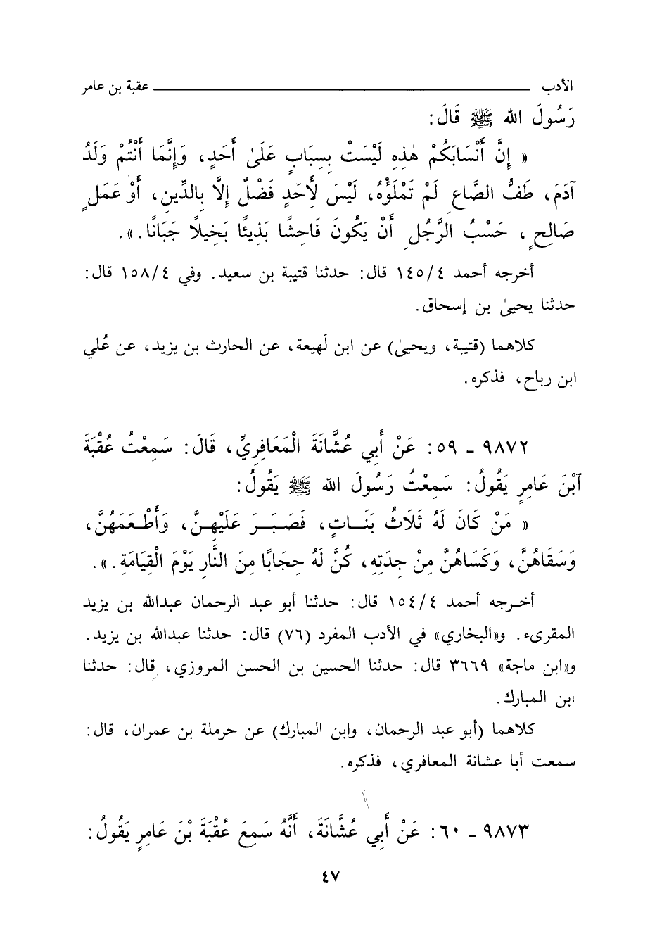 مَنْ كَانَ لَهُ ثَلَاثُ بَنَاتٍ، فَصَبَرَ عَلَيْهِنَّ، وَأَطْعَمَهُنَّ، وَسَقَاهُنَّ، وَكَسَاهُنَّ مِنْ جِدَتِهِ، كُنَّ لَهُ حِجَابًا مِنَ النًّارِ يَوْمَ الْقِيَامَةِ.