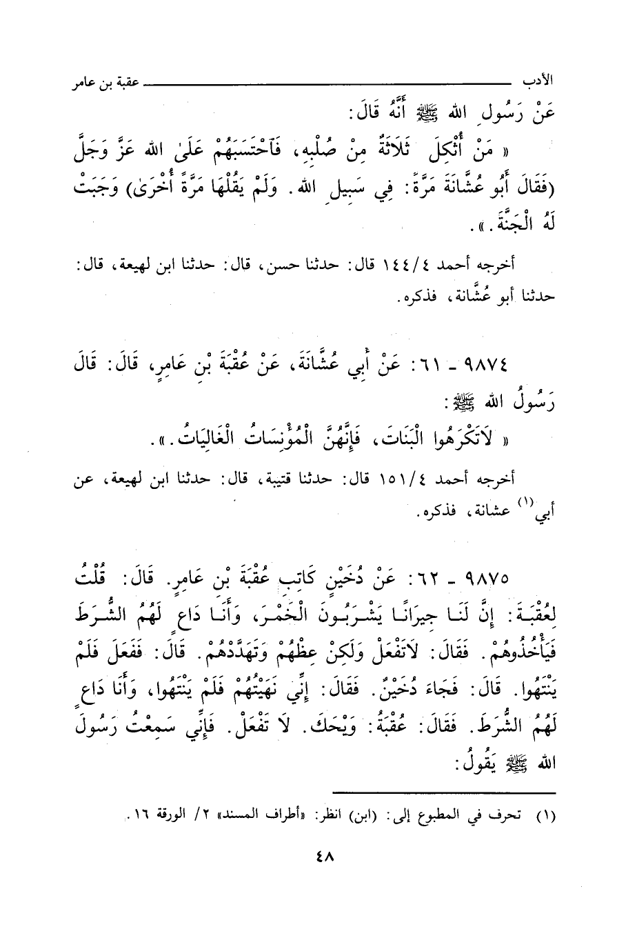 ٩٨٧٤ - عَنْ أَبِي عُشَّانَةَ، عَنْ عُقْبَةَ بْنِ عَامِرٍ، قَالَ: قَالَ رَسُولُ اللهِ صلى الله عليه وسلم: