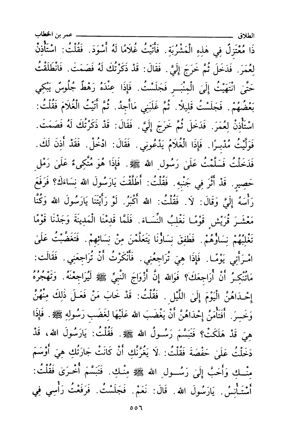 - وفي رواية: عَنِ ابْنِ عَبَّاسٍ، رَضِيَ اللهُ عَنْهُمَا، قَالَ: لَبِثْتُ سَنَةً، وَأَنَا أُرِيدُ أَنْ أَسْأَلَ عُمَرَ عَنِ الْمَرْأَتَيْنِ اللَّتَيْنِ تَظَاهَرَتَا عَلَى النَّبِيِّ صلى الله عليه وسلم، فَجَعَلْتُ أَهَابُهُ، فَنَزَلَ يَوْمًا مَنْزِلاً، فَدَخَلَ الأَرَاكَ، فَلَمَّا خَرَجَ سَأَلْتُهُ؟ فَقَالَ: عَائِشَةُ، وَحَفْصَةُ، ثُمَّ قَالَ: كُنَّا فِى الْجَاهِلِيَّةِ لَا نَعُدُّ النِّسَاءَ شَيْئًا، فَلَمَّا جَاءَ الإِسْلَامُ وَذَكَرَهُنَّ اللهُ، رَأَيْنَا لَهُنَّ بِذَلِكَ عَلَيْنَا حَقًّا، مِنْ غَيْرِ أَنْ نُدْخِلَهُنَّ فِي شَيْءٍ مِنْ أُمُورِنَا، وَكَانَ بَيْنِي وَبَيْنَ امْرَأَتِي كَلَامٌ، فَأَغْلَظَتْ لِي، فَقُلْتُ لَهَا: وَإِنَّكِ لَهُنَاكِ؟! قَالَتْ: تَقُولُ هَذَا لِي، وَابْنَتُكَ تُؤْذِي النَّبِيَّ صلى الله عليه وسلم؟! فَأَتَيْتُ حَفْصَةَ، فَقُلْتُ لَهَا: إِنِّي أُحَذِّرُكِ أَنْ تَعْصِي اللهَ وَرَسُولَهُ، وَتَقَدَّمْتُ إِلَيْهَا فِي أَذَاهُ، فَأَتَيْتُ أُمَّ سَلَمَةَ، فَقُلْتُ لَهَا، فَقَالَتْ: أَعْجَبُ مِنْكَ يَا عُمَرُ، قَدْ دَخَلْتَ فِي أُمُورِنَا، فَلَمْ يَبْقَ إِلَاّ أَنْ تَدْخُلَ بَيْنَ رَسُولِ اللهِ صلى الله عليه وسلم وَأَزْوَاجِهِ، فَرَدَّدَتْ، وَكَانَ رَجُلٌ مِنَ الأَنْصَارِ إِذَا غَابَ عَنْ رَسُولِ اللهِ صلى الله عليه وسلم وَشَهِدْتُهُ، أَتَيْتُهُ بِمَا يَكُونُ، وَإِذَا غِبْتُ عَنْ رَسُولِ اللهِ صلى الله عليه وسلم وَشَهِدَ، أَتَانِي بِمَا يَكُونُ مِنْ رَسُولِ اللهِ صلى الله عليه وسلم، وَكَانَ مَنْ حَوْلَ رَسُولِ اللهِ صلى الله عليه وسلم قَدِ اسْتَقَامَ لَهُ، فَلَمْ يَبْقَ إِلَاّ مَلِكُ غَسَّانَ بِالشَّأْمِ، كُنَّا نَخَافُ أَنْ يَأْتِيَنَا، فَمَا شَعَرْتُ إِلَاّ بِالأَنْصَارِيِّ وَهْوَ يَقُولُ: إِنَّهُ قَدْ