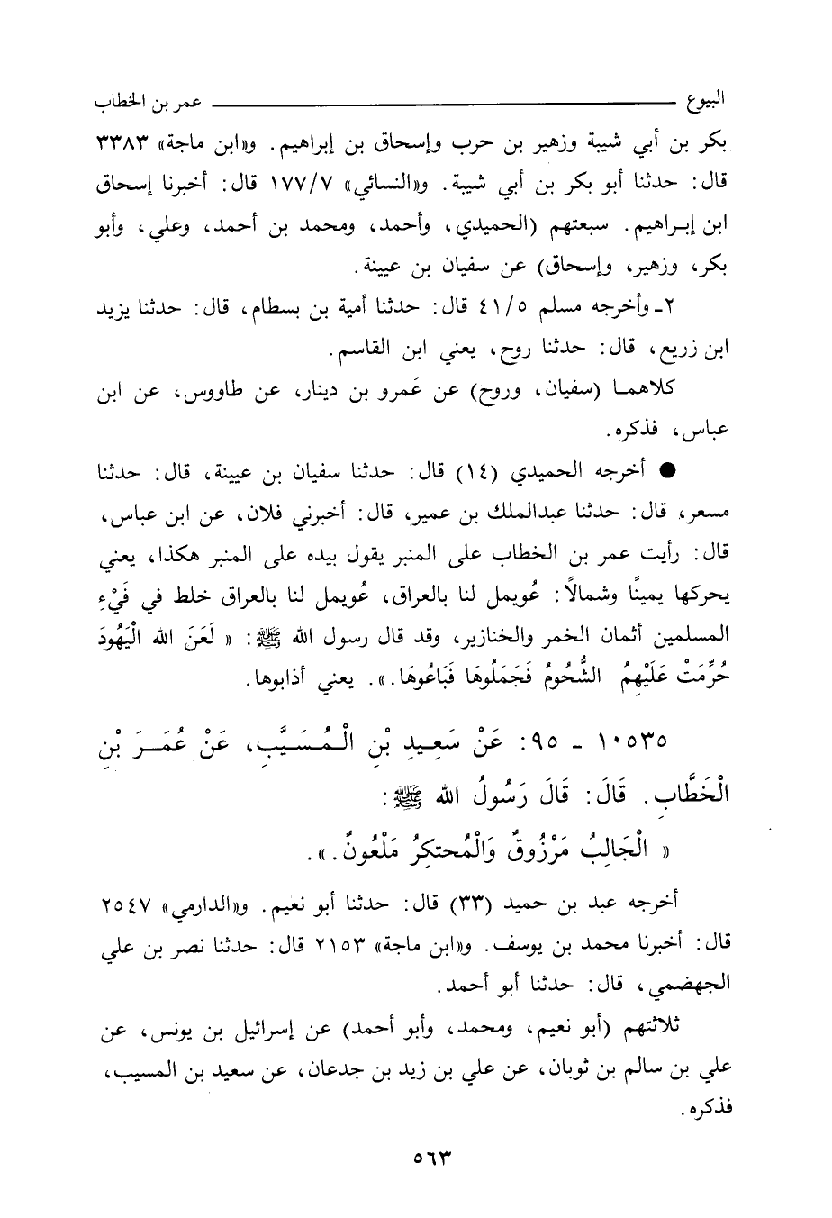 - أخرجه الحُمَيْدِي (١٤) قال: حدَّثنا سُفْيان بن عُيَيْنَة، حدَّثنا مِسْعَر، حدَّثنا عَبْد الملك ابن عُمَيْر، قال: أخبرني فُلان، عَنِ ابْنِ عَبَّاسٍ، قَالَ: رَأَيْتُ عُمَرَ بْنَ الْخَطَّابِ عَلَى الْمِنْبَرِ يَقُولُ بِيَدِهِ عَلَى الْمِنْبَرِ هَكَذَا، يَعْنِي يُحَرِّكُهَا يَمِينًا وَشِمَالاً، عُوَيْمِلٌ لَنَا بِالْعِرَاقِ، عُوَيْمِلٌ لَنَا بِالْعِرَاقِ، خَلَطَ فِي فَيْءِ الْمُسْلِمِينَ أَثْمَانَ الْخَمْرِ وَالْخَنَازِيرِ، وَقَدْ قَالَ رَسُولُ اللهِ صلى الله عليه وسلم: