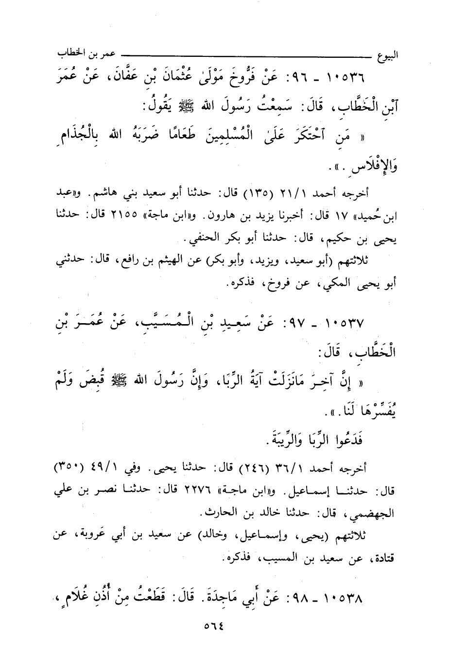 - وفي رواية: عَنْ فَرُّوخَ، مَوْلَى عُثْمَانَ، أَنَّ عُمَرَ، وَهُوَ يَوْمَئِذٍ أَمِيرُ الْمُؤْمِنِينَ، خَرَجَ إِلَى الْمَسْجِدِ، فَرَأَى طَعَامًا مَنْثُورًا، فَقَالَ: مَا هَذَا الطَّعَامُ؟ فَقَالُوا: طَعَامٌ جُلِبَ إِلَيْنَا، قَالَ: بَارَكَ اللهُ فِيهِ وَفِيمَنْ جَلَبَهُ، قِيلَ: يَا أَمِيرَ الْمُؤْمِنِينَ، فَإِنَّهُ قَدِ احْتُكِرَ، قَالَ: وَمَنِ احْتَكَرَهُ؟ قَالُوا: فَرُّوخُ مَوْلَى عُثْمَانَ، وَفُلَانٌ مَوْلَى عُمَرَ، فَأَرْسَلَ إِلَيْهِمَا فَدَعَاهُمَا، فَقَالَ: مَا حَمَلَكُمَا عَلَى احْتِكَارِ طَعَامِ الْمُسْلِمِينَ؟ قَالَا: يَا أَمِيرَ الْمُؤْمِنِينَ، نَشْتَرِى بِأَمْوَالِنَا وَنَبِيعُ، فَقَالَ عُمَرُ: سَمِعْتُ رَسُولَ اللهِ صلى الله عليه وسلم يَقُولُ: