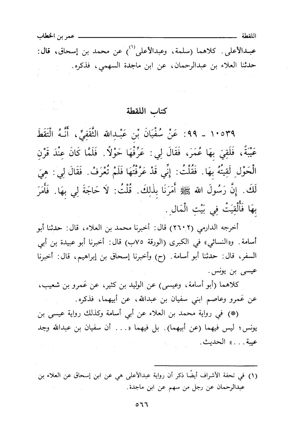 كلاهما (أبو أُسَامة، وعِيسَى) عن الوَلِيد بن كَثِير، قال: حدَّثني عَمْرو بن شُعَيْب، عن عَمْرو، وعاصم، ابني سُفْيان بن عَبْد اللهِ بن ربَيِعَة الثَّقَفِي؛ أَنَّ سُفْيَانَ بْنَ عَبْدِ اللهِ وَجَدَ عَيْبَةً، فَأَتَى بِهَا عُمَرَ بْنَ الْخَطَّابِ، فَقَالَ: عَرِّفْهَا سَنَةً، فَإِنْ عُرِفَتْ فَذَاكَ، وَإِلَاّ فَهِيَ لَكَ، فَلَمْ تُعْرَفْ، فَلَقِيَهُ بِهَا فِي الْعَامِ الْمُقْبِلِ، فِي الْمَوْسِمِ، فَذَكَرَهَا لَهُ، فَقَالَ عُمَرُ: هِيَ لَكَ، فَإِنَّ رَسُوَل اللهِ صلى الله عليه وسلم أَمَرَنَا بِذَلِكَ، قَالَ: لَا حَاجَةَ لِي بِهَا، فَقَبَضَهَا عُمَرُ، فَجَعَلَهَا فِي بَيْتِ الْمَالِ. مي