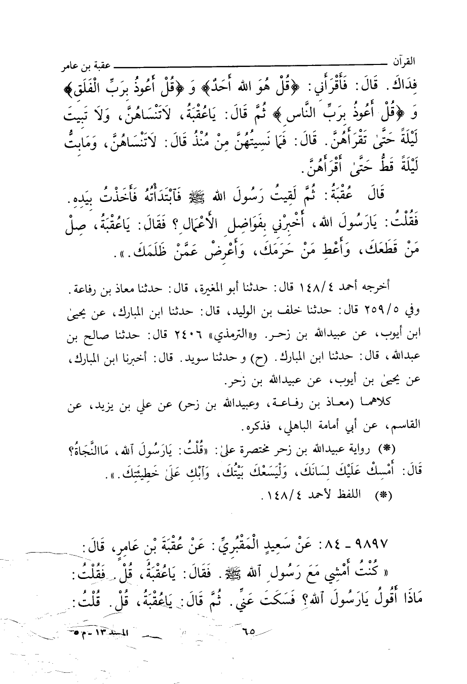كُنْتُ أَمْشِي مَعَ رَسُولِ اللهِ صلى الله عليه وسلم، فَقَالَ: يَا عُقْبَةُ، قُلْ، فَقُلْتُ: مَاذَا أَقُولُ يَا رَسُولَ اللهِ؟ فَسَكَتَ عَنِّي، ثُمَّ قَالَ: يَا عُقْبَةُ، قُلْ، قُلْتُ: