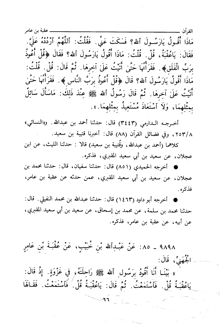 مَاذَا أَقُولُ يَا رَسُولَ اللهِ؟ فَسَكَتَ عَنِّي، فَقُلْتُ: اللَّهُمَّ ارْدُدْهُ عَلَيَّ، فَقَالَ: يَا عُقْبَةُ، قُلْ، قُلْتُ: مَاذَا أَقُولُ يَا رَسُولَ اللهِ؟ فَقَالَ: " قُلْ أَعُوذُ بِرَبِّ الْفَلَقِ) فَقَرَأْتُهَا حَتَّى أَتَيْتُ عَلَى آخِرِهَا، ثُمَّ قَالَ: قُلْ، قُلْتُ: مَاذَا أَقُولُ يَا رَسُولَ اللهِ؟ قَالَ: " قُلْ أَعُوذُ بِرَبِّ النَّاسِ) فَقَرَأْتُهَا حَتَّى أَتَيْتُ عَلَى آخِرِهَا، ثُمَّ قَالَ رَسُولُ اللهِ صلى الله عليه وسلم، عِنْدَ ذَلِكَ: مَا سَأَلَ سَائِلٌ بِمِثْلِهِمَا، وَلَا اسْتَعَاذَ مُسْتَعِيذٌ بِمِثْلِهِمَا.