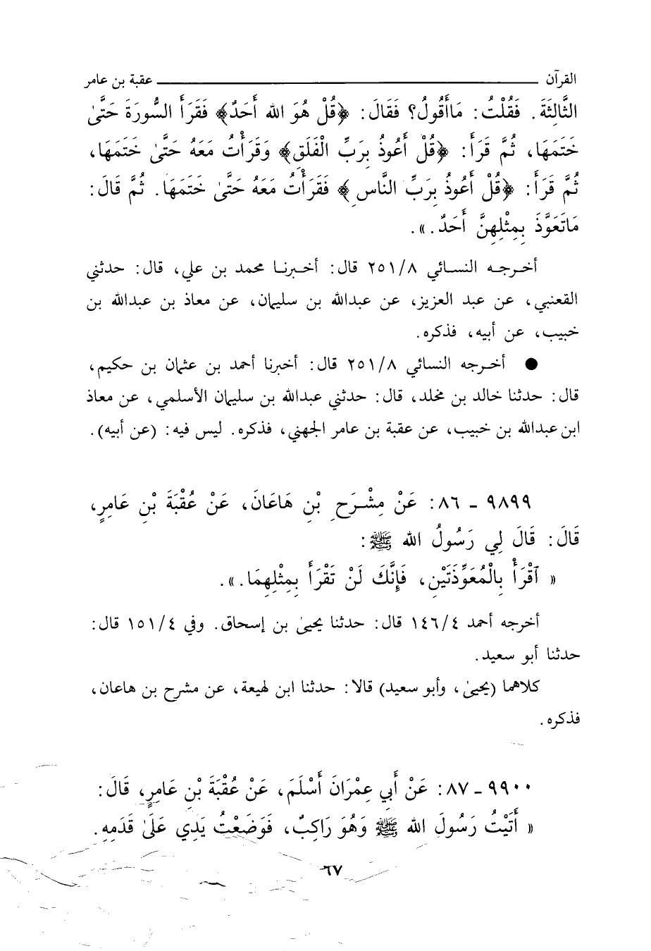 - وفي رواية: كُنْتُ مَعَ رَسُولِ اللَّهِ صلى الله عليه وسلم فِي طَرِيقِ مَكَّةَ، فَأَصَبْتُ خَلْوَةً مِنْ رَسُولِ اللَّهِ صلى الله عليه وسلم، فَدَنَوْتُ مِنْهُ، فَقَالَ: قُلْ، فَقُلْتُ: مَا أَقُولُ؟ قَالَ: قُلْ، قُلْتُ: مَا أَقُولُ؟ قَالَ: " قُلْ أَعُوذُ بِرَبِّ الْفَلَقِ)، حَتَّى خَتَمَهَا، ثُمَّ قَالَ: " قُلْ أَعُوذُ بِرَبِّ النَّاسِ)، حَتَّى خَتَمَهَا، ثُمَّ قَالَ: مَا تَعَوَّذَ النَّاسُ بِأَفْضَلَ مِنْهُمَا.
