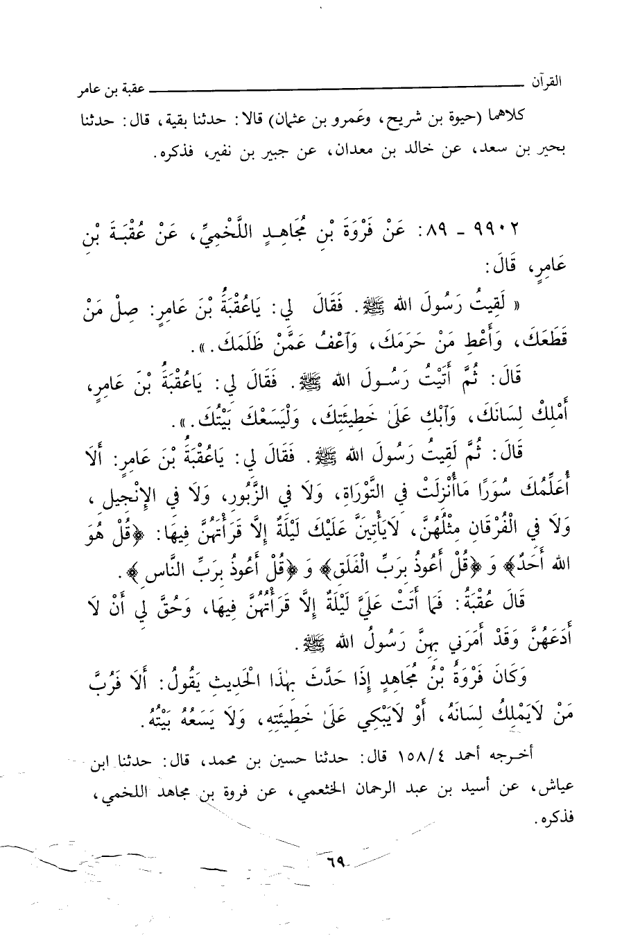 قَالَ: ثُمَّ لَقِيتُ رَسُولَ اللهِ صلى الله عليه وسلم، فَقَالَ لِى: يَا عُقْبَةُ بْنَ عَامِرٍ، أَلَا أُعَلِّمُكَ سُوَرًا مَا أُنْزِلَتْ فِي التَّوْرَاةِ، وَلَا فِي الزَّبُورِ، وَلَا فِي الإِنْجِيلِ، وَلَا فِي الْفُرْقَانِ مِثْلُهُنَّ، لَا يَأْتِيَنَّ عَلَيْكَ لَيْلَةٌ إِلَاّ قَرَأْتَهُنَّ فِيهَا: " قُلْ هُوَ اللَّهُ أَحَدٌ) وَ (قُلْ أَعُوذُ بِرَبِّ الْفَلَقِ) وَ (قُلْ أَعُوذُ بِرَبِّ النَّاسِ ".