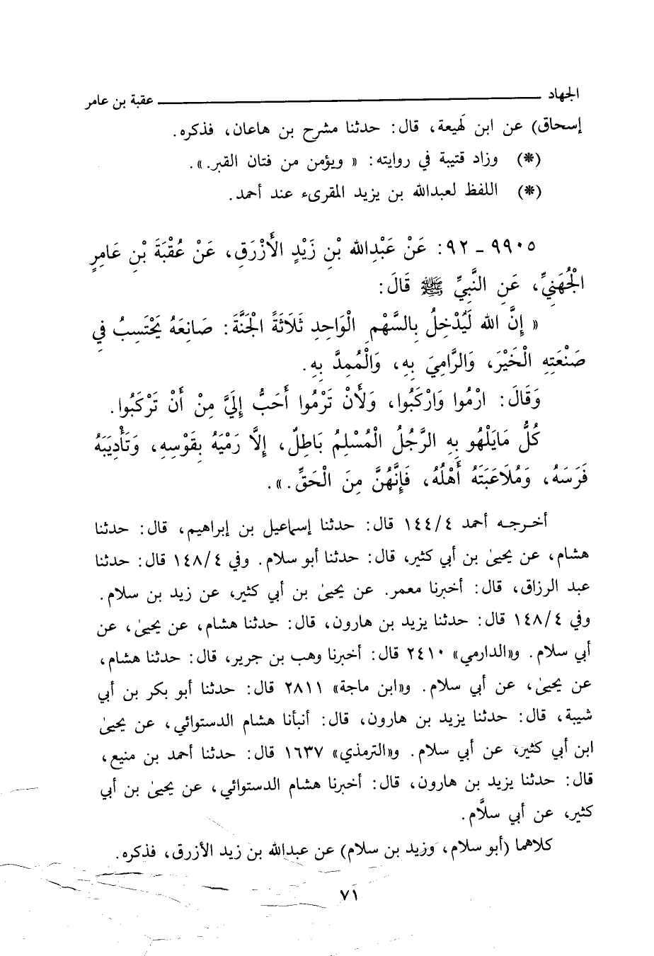 - وفي رواية: عَنْ عَبْدِ اللهِ بْنِ زَيْدٍ الأَزْرَقِ، قَالَ: كَانَ عُقْبَةُ بْنُ عَامِرٍ الْجُهَنِيُّ يَخْرُجُ فَيَرْمِي كُلَّ يَوْمٍ، وَكَانَ يَسْتَتْبِعُهُ، فَكَأَنَّهُ كَادَ أَنْ يَمَلَّ، فَقَالَ: أَلَا أُخْبِرُكَ بِمَا سَمِعْتُ مِنْ رَسُولِ اللهِ صلى الله عليه وسلم؟ قَالَ: بَلَى، قَالَ: سَمِعْتُهُ يَقُولُ: إِنَّ اللهَ، عَزَّ وَجَلَّ، يُدْخِلُ بِالسَّهْمِ الْوَاحِدِ ثَلَاثَةَ نَفَرٍ الْجَنَّةَ: صَاحِبَهُ الَّذِي يَحْتَسِبُ فِي صَنْعَتِهِ الْخَيْرَ، وَالَّذِي يُجَهِّزُ بِهِ فِي سَبِيلِ اللهِ، وَالَّذِي يَرْمِي بِهِ فِي سَبِيلِ اللهِ. وَقَالَ: ارْمُوا وَارْكَبُوا، وَإِنْ تَرْمُوا خَيْرٌ مِنْ أَنْ تَرْكَبُوا. وَقَالَ: كُلُّ شَيْءٍ يَلْهُو بِهِ ابْنُ آدَمَ فَهُوَ بَاطِلٌ، إِلَاّ ثَلَاثًا: رَمْيَهُ عَنْ قَوْسِهِ، وَتَأْدِيبَهُ فَرَسَهُ، وَمُلَاعَبَتَهُ أَهْلَهُ، فَإِنَّهُنَّ مِنَ الْحَقِّ.