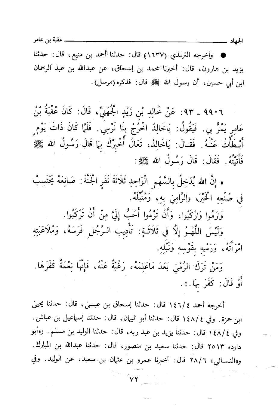 - وفي رواية: عَنْ خَالِدِ بْنِ زَيْدٍ الأَنْصَارِيِّ، قَالَ: كُنْتُ مَعَ عُقْبَةَ بْنِ عَامِرٍ الْجُهَنِيِّ، وَكَانَ رَجُلاً يُحِبُّ الرَّمْيَ، إِذَا خَرَجَ خَرَجَ بِي مَعَهُ، فَدَعَانِي يَوْمًا، فَأَبْطَأْتُ عَلَيْهِ، فَقَالَ: تَعَالَ أَقُولُ لَكَ مَا قَالَ لِي رَسُولُ اللهِ صلى الله عليه وسلم، وَمَا حَدَّثَنِي، سَمِعْتُ رَسُولَ اللهِ صلى الله عليه وسلم يَقُولُ: إِنَّ اللهَ، عَزَّ وَجَلَّ، يُدْخِلُ بِالسَّهْمِ الْوَاحِدِ ثَلَاثَةَ نَفَرٍ الْجَنَّةَ، صَانِعَهُ الْمُحْتَسِبَ فِي صَنْعَتِهِ الْخَيْرَ، وَالرَّامِيَ بِهِ، وَمُنْبِلَهُ. وَقَالَ: ارْمُوا وَارْكَبُوا، وَلأَنْ تَرْمُوا أَحَبُّ إِلَيَّ مِنْ أَنْ تَرْكَبُوا، وَلَيْسَ مِنَ اللَّهْوِ إِلَاّ ثَلَاثٌ: تَأْدِيبُ الرَّجُلِ فَرَسَهُ، وَمُلَاعَبَتُهُ امْرَأَتَهُ، وَرَمْيُهُ بِقَوْسِهِ، وَمَنْ تَرَكَ الرَّمْيَ بَعْدَ مَا عَلِمَهُ، رَغْبَةً عَنْهُ، فَإِنَّهَا نِعْمَةٌ تَرَكَهَا.