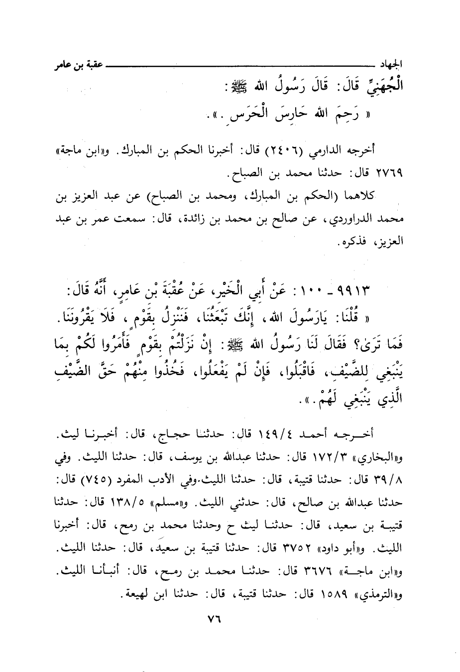- وفي رواية: قُلْتُ: يَا رَسُولَ اللهِ، إِنَّا نَمُرُّ بِقَوْمٍ، فَلَا هُمْ يُضَيِّفُونَا، وَلَا هُمْ يُؤَدُّونَ مَا لَنَا عَلَيْهِمْ مِنَ الْحَقِّ، وَلَا نَحْنُ نَأْخُذُ مِنْهُمْ، فَقَالَ رَسُولُ اللهِ صلى الله عليه وسلم: إِنْ أَبَوْا إِلَاّ أَنْ تَأْخُذُوا كَرْهًا فَخُذُوا.