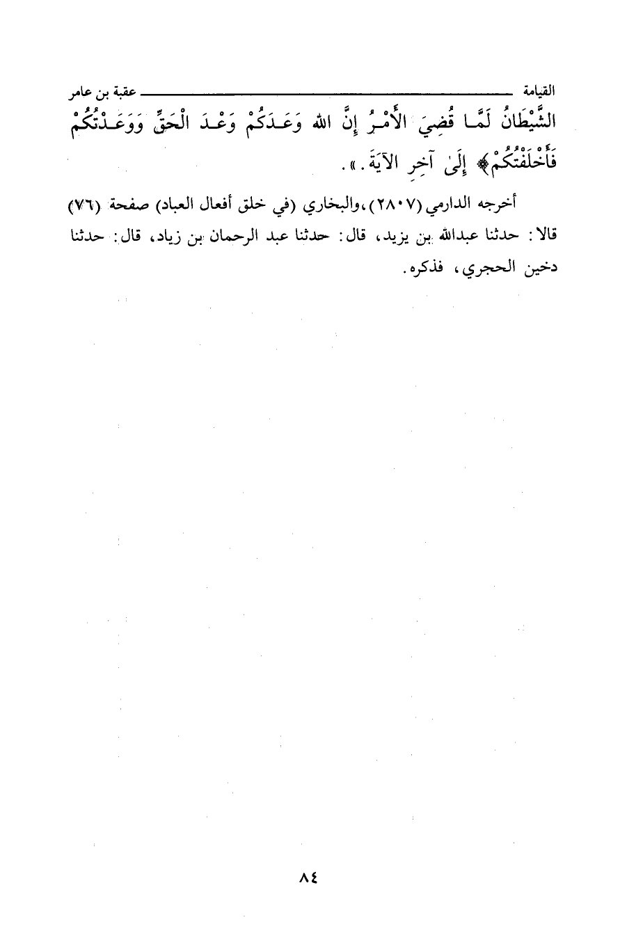 أخرجه الدَّارِمِي (٢٨٠٤. والبُخَارِي (في خلق أفعال العباد) ٧٦ قالا: حدَّثنا عَبْد الله بن يَزِيد , حدَّثنا عَبْد الرَّحْمان بن زِيَاد، حدَّثنا دُخَيْن الحَجْرِي، فذكره.