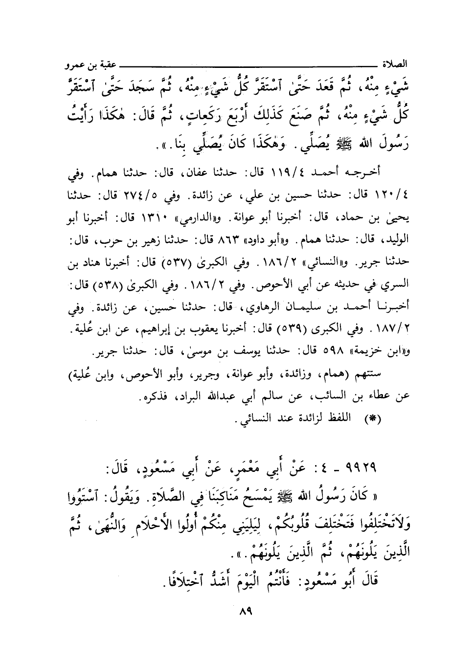 - وفي رواية: عَنْ سَالِمٍ الْبَرَّادِ، قَالَ: أَتَيْنَا أَبَا مَسْعُودٍ الأَنْصَارِيَّ فِي بَيْتِهِ، فَقُلْنَا: عَلِّمْنَا صَلَاةَ رَسُولِ اللهِ صلى الله عليه وسلم، فَصَلَّى، فَلَمَّا سَجَدَ وَضَعَ كَفَّيْهِ قَرِيبًا مِنْ رَأْسِهِ.