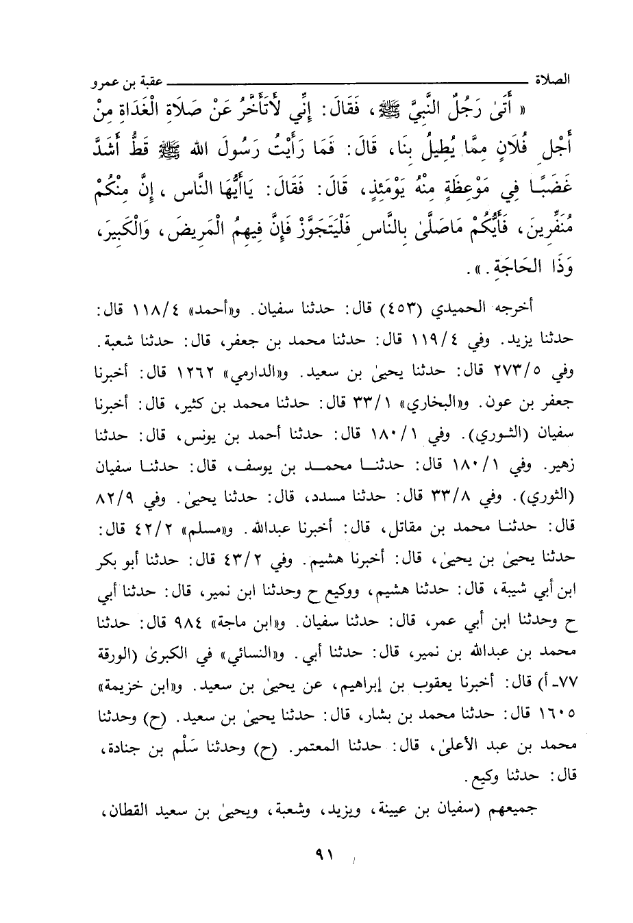 - وفي رواية: أَتَى رَجُلٌ النَّبِيَّ صلى الله عليه وسلم، فَقَالَ: إِنِّي لأَتَأَخَّرُ عَنْ صَلَاةِ الْغَدَاةِ مِنْ أَجْلِ فُلَانٍ مِمَّا يُطِيلُ بِنَا، قَالَ: فَمَا رَأَيْتُ رَسُولَ اللهِ صلى الله عليه وسلم قَطُّ أَشَدَّ غَضَبًا فِي مَوْعِظَةٍ مِنْهُ يَوْمَئِذٍ، قَالَ: فَقَالَ: يَا أَيُّهَا النَّاسُ، إِنَّ مِنْكُمْ مُنَفِّرِينَ، فَأَيُّكُمْ مَا صَلَّى بِالنَّاسِ فَلْيَتَجَوَّزْ، فَإِنَّ فِيهِمُ الْمَرِيضَ وَالْكَبِيرَ وَذَا الْحَاجَةِ.