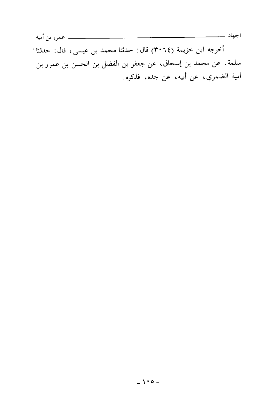 أخرجه ابن خُزَيْمة (٣٠٦٤) قال: حدَّثنا مُحَمد بن عِيسَى، حدَّثنا سَلَمَة، عن مُحَمد بن إِسْحَاق، عن جَعْفَر بن الفَضْل بن الحَسَن بن عَمْرو بن أُمَيَّة الضَّمْرِيّ، عن أبيه، عن جَدِّه، فذكره.