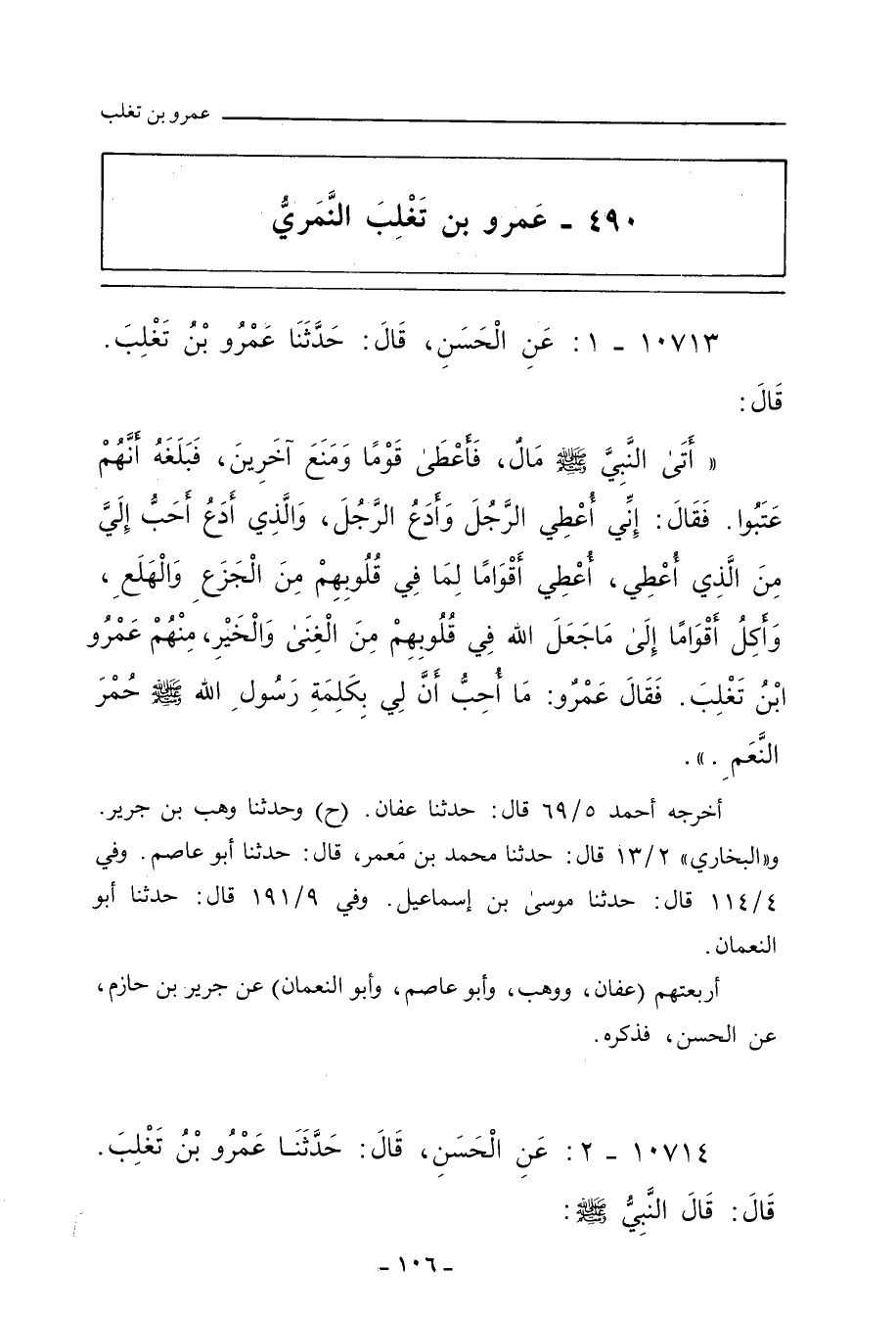 - وفي رواية: أَنَّ رَسُولَ اللهِ صلى الله عليه وسلم أَتَاهُ شَيْءٌ، فَأَعْطَاهُ نَاسًا، وَتَرَكَ نَاسًا - وَقَالَ جَرِيرٌ: أَعْطَى رِجَالاً، وَتَرَكَ رِجَالاً - قَالَ: فَبَلَغَهُ عَنِ الَّذِينَ تَرَكَ أَنَّهُمْ عَتَِبُوا وَقَالُوا، قَالَ: فَصَعِدَ الْمِنْبَرَ، فَحِمَدَ اللهَ وَأَثْنَى عَلَيْهِ، ثُمَّ قَالَ: إِنِّي أُعْطِي نَاسًا، وَأَدَعُ نَاسًا، وَأُعْطِي رِجَالاً، وَأَدَعُ رِجَالاً - قَالَ عَفَّانُ: قَالَ ذِي وَذِي - وَالَّذِي أَدَعُ أَحَبُّ إِلَيَّ مِنَ الَّذِي أُعْطِي، أُعْطِي أُنَاسًا لِمَا فِي قُلُوبِهِمْ مِنَ الْجَزَعِ وَالْهَلَعِ، وَأَكِلُ قَوْمًا إِلَى مَا جَعَلَ اللهُ فِي قُلُوبِهِمْ مِنَ الْغِنَى وَالْخَيْرِ، مِنْهُمْ عَمْرُو بْنُ تَغْلِبَ، قَالَ: وَكُنْتُ جَالِسًا تِلْقَاءَ وَجْهِ رَسُولِ اللهِ صلى الله عليه وسلم، فَقَالَ: مَا أُحِبُّ أَنَّ لِي بِكَلِمَةِ رَسُولِ اللهِ صلى الله عليه وسلم حُمْرَ النَّعَمِ (٢٠٩٤٨)