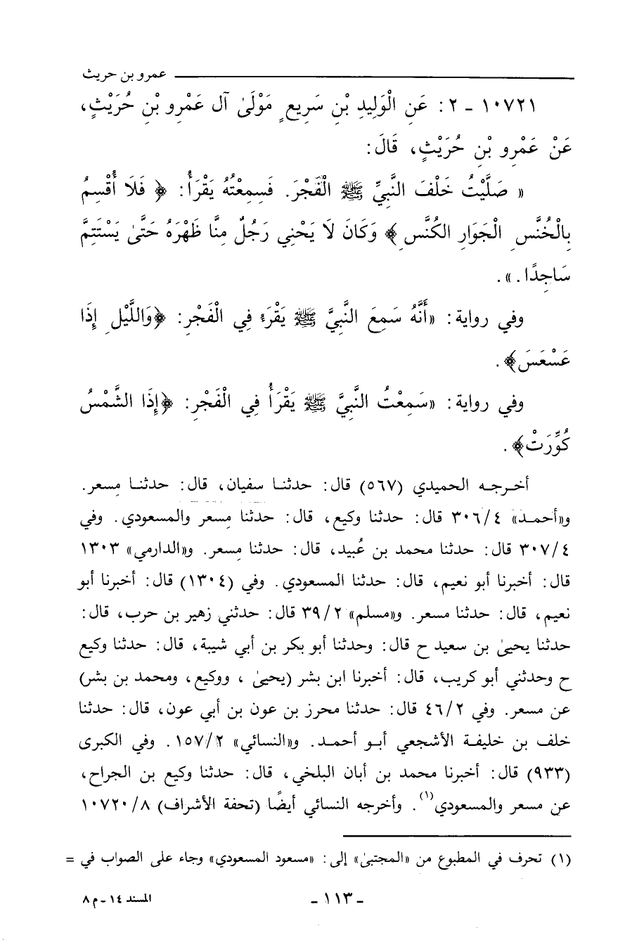 - وفي رواية: سَمِعْتُ النَّبِيَّ صلى الله عليه وسلم يَقْرَأُ فِي الْفَجْرِ: ?إِذَا الشَّمْسُ كُوِّرَتْ?. س ٢/ ١٥٧