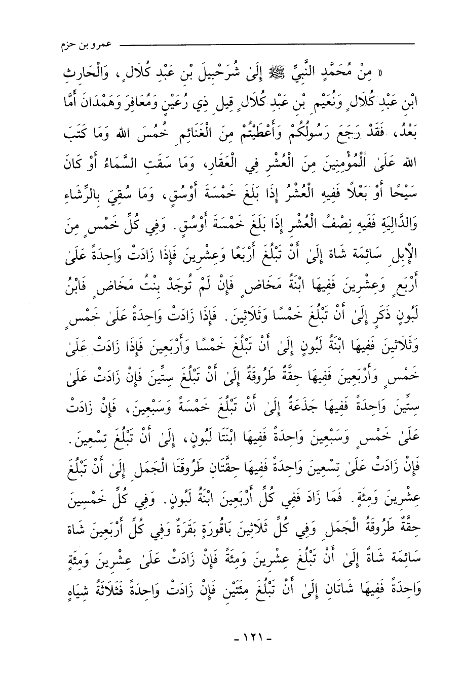 مِنْ مُحَمَّدٍ النَّبِيِّ صلى الله عليه وسلم، إِلَى شُرَحْبِيلَ بْنِ عَبْدِ كُلَالٍ، وَالْحَارِثِ بْنِ عَبْدِ كُلَالٍ، وَنُعَيْمِ بْنِ عَبْدِ كُلَالٍ قَيْلِ ذِي رُعَيْنٍ، وَمُعَافِرَ، وَهَمْدَانَ، أَمَّا بَعْدُ، فَقَدْ رَجَعَ رَسُولُكُمْ، وَأَعْطَيْتُمْ مِنَ الْغَنَائِمِ خُمُسَ اللهِ، وَمَا كَتَبَ اللهُ عَلَى الْمُؤْمِنِينَ مِنَ الْعُشْرِ فِي الْعَقَارِ، وَمَا سَقَتِ السَّمَاءُ، أَوْ كَانَ سَيْحًا، أَوْ بَعْلاً، فَفِيهِ الْعُشْرُ إِذَا بَلَغَ خَمْسَةَ أَوْسُقٍ، وَمَا سُقِيَ بِالرِّشَاءِ وَالدَّالِيَةِ، فَفِيهِ نِصْفُ الْعُشْرِ إِذَا بَلَغَ خَمْسَةَ أَوْسُقٍ، وَفِي كُلِّ خَمْسٍ مِنَ الإبِلِ سَائِمَةٍ شَاةٌ، إِلَى أَنْ تَبْلُغَ أَرْبَعًا وَعِشْرِينَ، فَإِذَا زَادَتْ وَاحِدَةً عَلَى أَرْبَعٍ وَعِشْرِينَ، فَفِيهَا ابْنَةُ مَخَاضٍ، فَإِنْ لَمْ تُوجَدْ بِنْتُ مَخَاضٍ، فَابْنُ لَبُونٍ ذَكَرٍ، إِلَى أَنْ تَبْلُغَ خَمْسًا وَثَلَاثِينَ، فَإِذَا زَادَتْ عَلَى خَمْسٍ وَثَلَاثيِنَ، فَفِيهَا ابْنَةُ لَبُونٍ، إِلَى أَنْ تَبْلُغَ خَمْسًا وَأَرْبَعِينَ، فَإِذَا زَادَتْ عَلَى خَمْسٍ وَأَرْبَعِينَ، فَفِيهَا حِقَّةٌ طَرُوقَةٌ، إِلَى أَنْ تَبْلُغَ سِتِّينَ، فَإِنْ زَادَتْ عَلَى سِتِّينَ وَاحِدَةً، فَفِيهَا جَذَعَةٌ، إِلَى أَنْ تَبْلُغَ خَمْسَةً وَسَبْعِينَ، فَإِنْ زَادَتْ عَلَى خَمْسٍ وَسَبْعِينَ وَاحِدَةً، فَفِيهَا ابْنَتَا لَبُونٍ، إِلَى أَنْ تَبْلُغَ تِسْعِينَ، فَإِنْ