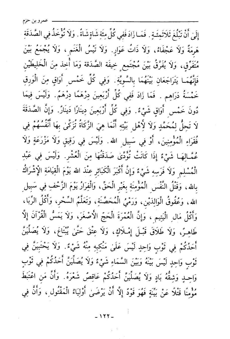 الْحَقِّ، وَالْفِرَارُ فِي سَبيلِ اللهِ يَوْمَ الزَّحْفِ، وَعُقُوقُ الْوَالِدَيْنِ، وَرَمْيُ الْمُحَصَّنَةِ، وَتَعَلَّمُ السِّحْرِ، وَأَكْلُ الرِّبَا، وَأَكْلُ مَالِ الْيَتِيمِ، وَإِنَّ الْعُمْرَةَ الْحَجُّ الأَصَْغَرَ، وَلَا يَمَسُّ الْقُرْآنَ إِلَاّ طَاهِرٌ، وَلَا طَلَاقَ قَبْلَ إِمْلَاكٍ، وَلَا عِتْقَ حَتَّى يُبْتَاعَ، وَلَا يُصَلِّيَنَّ أَحَدُكُمْ فِي ثَوْبٍ وَاحِدٍ، لَيْسَ عَلَى مَنْكِبِهِ مِنْهُ شَيْءٌ، وَلَا يَحْتَبِيَنَّ فِي ثَوْبٍ وَاحِدٍ، لَيْسَ بَيْنَهُ وَبَيْنَ السَّمَاءِ شَيْءٌ، وَلَا يُصَلِّيَنَّ أَحَدُكُمْ فِي ثَوْبٍ وَاحِدٍ وَشِقُّهُ بَادٍ، وَلَا يُصَلِّيَنَّ أَحَدُكُمْ عَاقِصًا شَعْرَهُ، وَإِنَّ مَنِ اعْتَبَطَ مُؤمِنًا قَتْلاً عَنْ بَيِّنَةٍ، فَهُوَ قَوَدٌ، إِلَاّ أَنْ يَرْضَى أَوْلِيَاءُ الْمَقْتُولِ، وَإِنَّ فِي