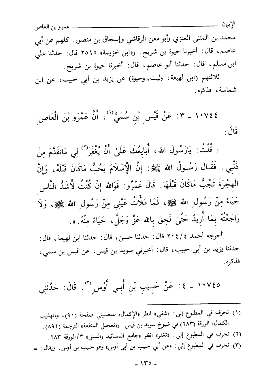 قُلْتُ: يَا رَسُولَ اللهِ، أُبَايِعُكَ عَلَى أَنْ يُغْفَرَ لِي مَا تَقَدَّمَ مِنْ ذَنْبِي؟ فَقَالَ رَسُولُ اللهِ صلى الله عليه وسلم: إِنَّ الإِسْلَامَ يَجُبُّ مَا كَانَ قَبْلَهُ، وَإِنَّ الْهِجْرَةَ تَجُبُّ مَا كَانَ قَبْلَهَا. قَالَ عَمْرٌو: فَوَاللهِ إِنْ كُنْتُ لأَشَدَّ النَّاسِ حَيَاءً مِنْ رَسُولِ اللهِ صلى الله عليه وسلم، فَمَا مَلأْتُ عَيْنِي مِنْ رَسُولِ اللهِ صلى الله عليه وسلم، وَلَا رَاجَعْتُهُ بِمَا أُرِيدُ، حَتَّى لَحِقَ بِاللهِ، عَزَّ وَجَلَّ، حَيَاءً مِنْهُ.
