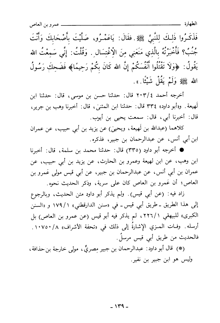 فَذَكَرُوا ذَلِكَ لِلنَّبِيِّ صلى الله عليه وسلم، فَقَالَ: يَا عَمْرُو، صَلَّيْتَ بِأَصْحَابِكَ وَأَنْتَ جُنُبٌ؟ فَأَخْبَرْتُهُ بِالَّذِي مَنَعَنِي مِنَ الاِغْتِسَالِ، وَقُلْتُ: إِنِّي سَمِعْتُ اللهَ يَقُولُ: ?وَلَا تَقْتُلُوا أَنْفُسَكُمْ إِنَّ اللهَ كَانَ بِكُمْ رَحِيمًا?، فَضَحِكَ رَسُولُ اللهِ صلى الله عليه وسلم، وَلَمْ يَقُلْ شَيْئًا. د