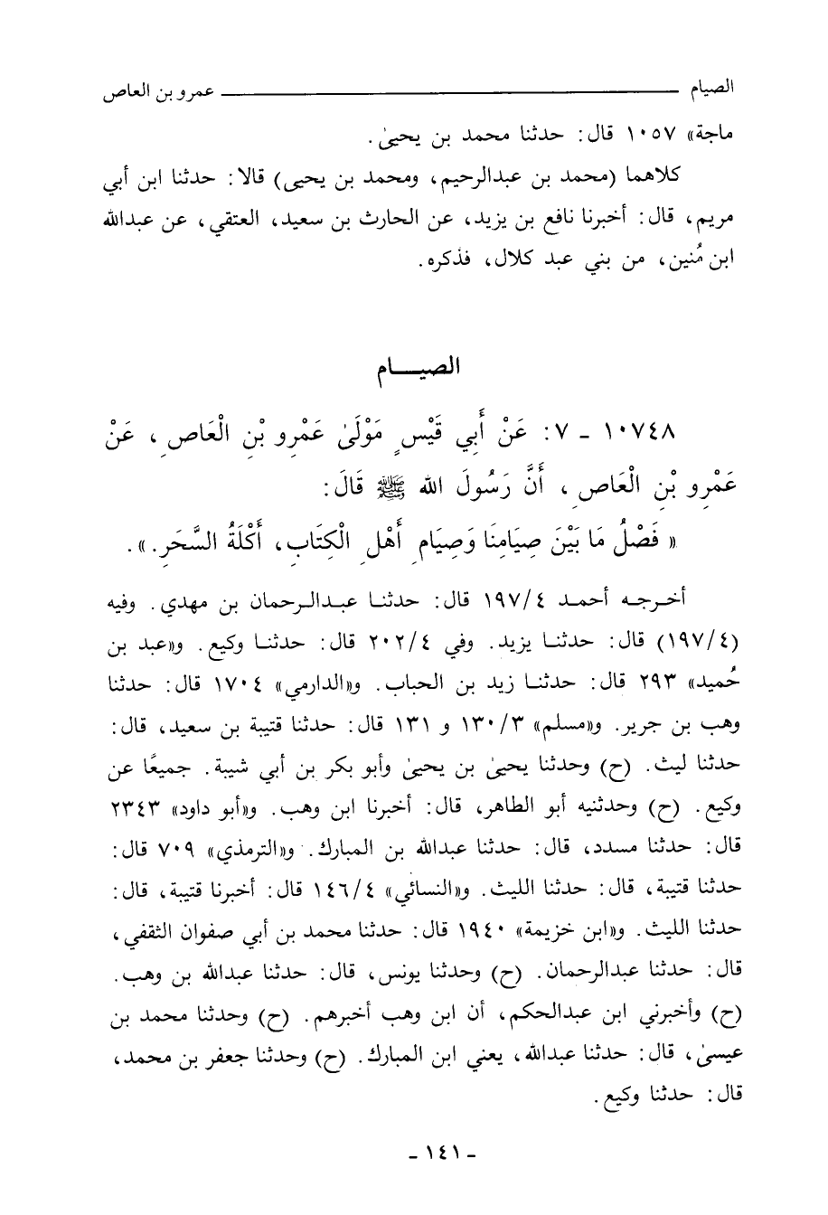 - وفي رواية: عَنْ أَبِي قَيْسٍ مَوْلَى عَمْرِو بْنِ الْعَاصِ، قَالَ: كَانَ عَمْرُو بْنُ الْعَاصِ يَأْمُرُنَا أَنْ نَصْنَعَ لَهُ الطَّعَامَ، يَتَسَحَّرُ بِهِ، فَلَا يُصِيبُ مِنْهُ كَثِيرًا، فَقُلْنَا: تَأْمُرُنَا بِهِ وَلَا تُصِيبُ مِنْهُ كَثِيرًا؟! قَالَ: إِنِّي لَا آمُرُكُمْ بِهِ أَنِّي أَشْتَهِيهِ، وَلَكِنِّي سَمِعْتُ النَّبِيَّ صلى الله عليه وسلم يَقُولُ: فَصْلُ مَا بَيْنَ صِيَامِنَا وَصِيَامِ أَهْلِ الْكِتَابِ، أَكْلَةُ السُّحَرِ. مي