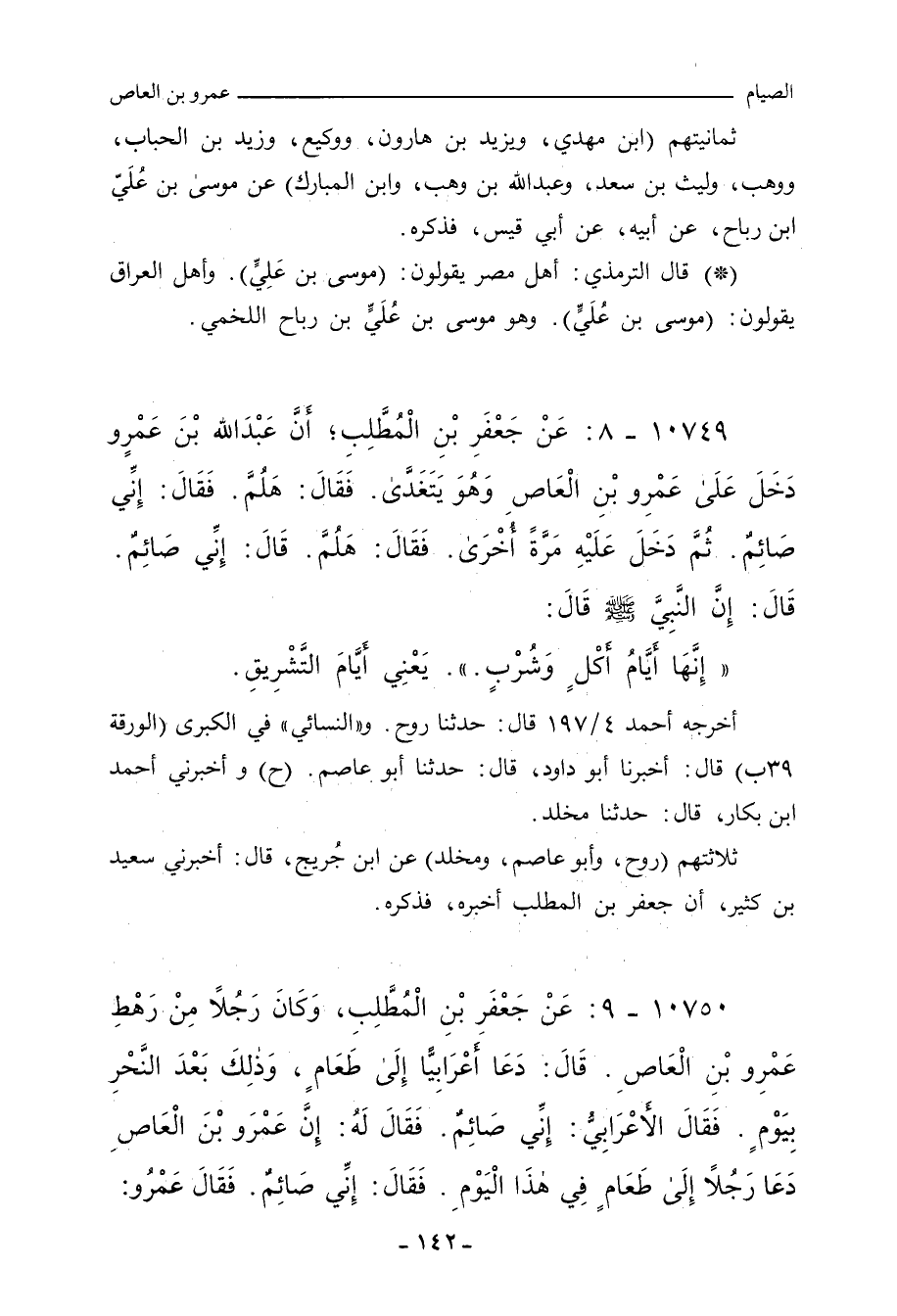 - وفي رواية: عَنْ جَعْفَرِ بْنِ الْمُطَّلِبِ، أَنَّ عَبْدَ اللهِ بْنَ عَمْرِو بْنِ الْعَاصِ دَخَلَ عَلَى عَمْرِو بْنِ الْعَاصِ، فَدَعَاهُ إِلَى الْغَدَاءِ، فَقَالَ: إِنِّي صَائِمٌ، ثُمَّ الثَّانِيَةَ كَذَلِكَ، ثُمَّ الثَّالِثَةَ كَذَلِكَ، فَقَالَ: لَا، إِلَاّ أَنْ تَكُونَ سَمِعْتَهُ مِنْ رَسُولِ اللهِ صلى الله عليه وسلم، فَقَالَ: فَإِنِّي سَمِعْتُهُ مِنْ رَسُولِ اللهِ صلى الله عليه وسلم. (