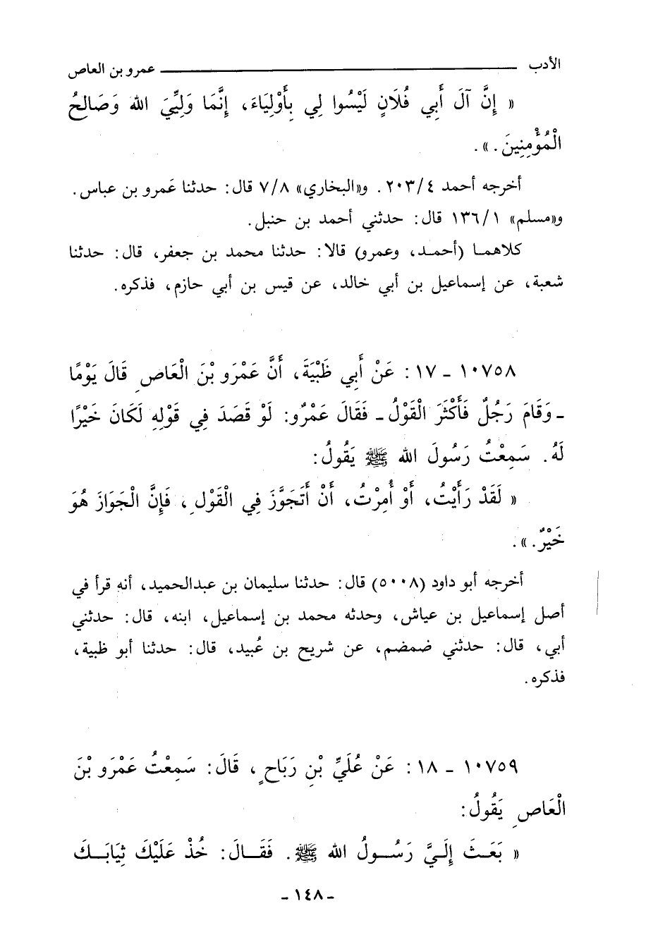 - قال البُخَاري عَقِب روايته: زاد عَنْبَسة بن عَبْد الواحد، عن بَيَان، عن قَيْس، عَنْ عَمْرِو بْنِ الْعَاصِ، قَالَ: سَمِعْتُ النَّبِيَّ صلى الله عليه وسلم، وَلَكِنْ لَهُمْ رَحِمٌ أَبُلُّهَا بِبَلَالِهَا، يَعْنِي أَصِلُهَا بِصِلَتِهَا.