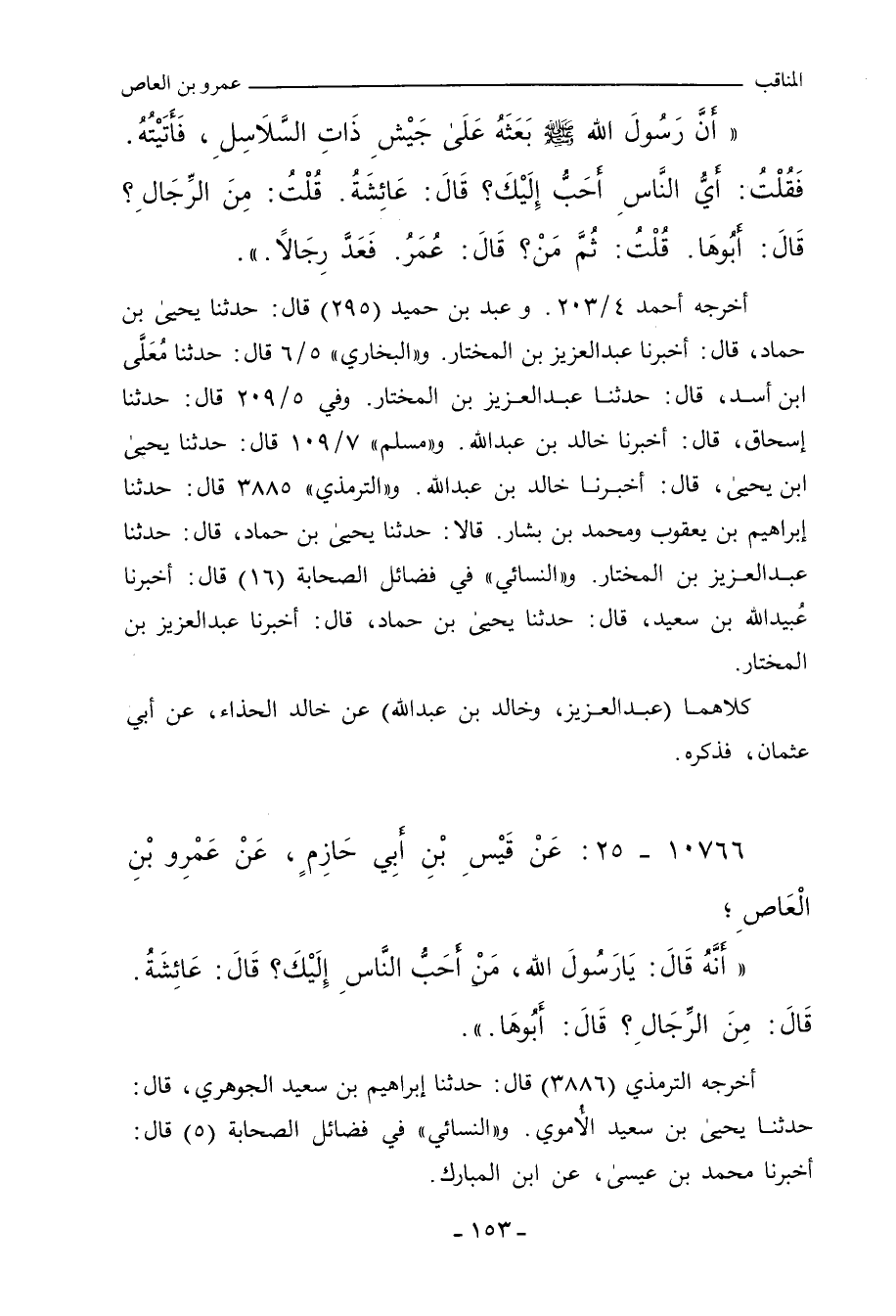 - وفي رواية: عَنْ أَبِي عُثْمَانَ؛ أَنَّ رَسُولَ اللهِ صلى الله عليه وسلم بَعَثَ عَمْرَو بْنَ الْعَاصِ عَلَى جَيْشِ ذَاتِ السَّلَاسِلِ، قَالَ: فَأَتَيْتُهُ، فَقُلْتُ: أَيُّ النَّاسِ أَحَبُّ إِلَيْكَ؟ قَالَ: عَائِشَةُ، قُلْتُ: مِنَ الرِّجَالِ؟ قَالَ: أَبُوهَا، قُلْتُ: ثُمَّ مَنْ؟ قَالَ: عُمَرُ، فَعَدَّ رِجَالاً، فَسَكَتُّ مَخَافَةَ أَنْ يَجْعَلَنِي فِي آخِرِهِمْ. خ (٤٣٥٨)
