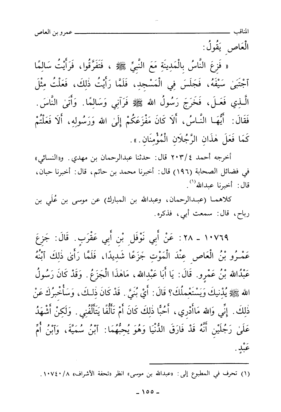 ١٠٧٦٩ - عَنْ أَبِي نَوْفَلِ بْنِ أَبِي عَقْرَبٍ، قَالَ: جَزِعَ عَمْرُو بْنُ الْعَاصِ عِنْدَ الْمَوْتِ جَزَعًا شَدِيدًا، فَلَمَّا رَأَى ذَلِكَ ابْنُهُ عَبْدُ اللهِ بْنُ عَمْرٍو، قَالَ: يَا أَبَا عَبْدِ اللهِ، مَا هَذَا الْجَزَعُ، وَقَدْ كَانَ رَسُولُ اللهِ صلى الله عليه وسلم يُدْنِيكَ وَيَسْتَعْمِلُكَ؟ قَالَ: أَيْ بُنَيَّ، قَدْ كَانَ ذَلِكَ، وَسَأُخْبِرُكَ عَنْ ذَلِكَ، إِنِّي وَاللهِ، مَا أَدْرِي أَحُبًّا كَانَ ذَلِكَ، أَمْ تَأَلُّفًا يَتَأَلَّفُنِي، وَلَكِنْ أَشْهَدُ عَلَى رَجُلَيْنِ أَنَّهُ قَدْ فَارَقَ الدُّنْيَا وَهُوَ يُحِبُّهُمَا: ابْنُ سُمَيَّةَ، وَابْنُ أُمِّ عَبْدٍ،
