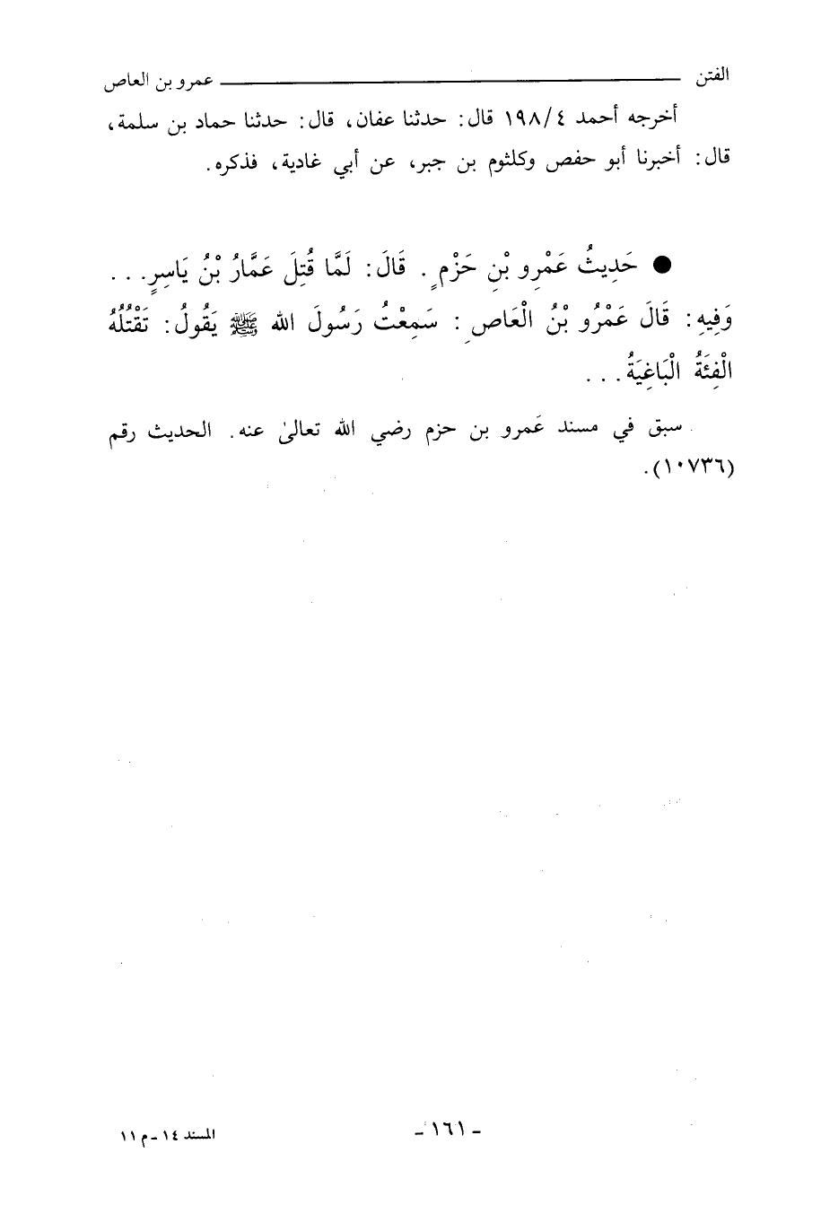 - حَدِيثُ مُحَمَّدِ بْنِ عَمْرِو بْنِ حَزْمٍ، قَالَ: لَمَّا قُتِلَ عَمَّارُ بْنُ يَاسِرٍ، دَخَلَ عَمْرُو بْنُ حَزْمٍ عَلَى عَمْرِو بْنِ الْعَاصِ، فَقَالَ: قُتِلَ عَمَّارٌ، وَقَدْ قَالَ رَسُولُ اللهِ صلى الله عليه وسلم: