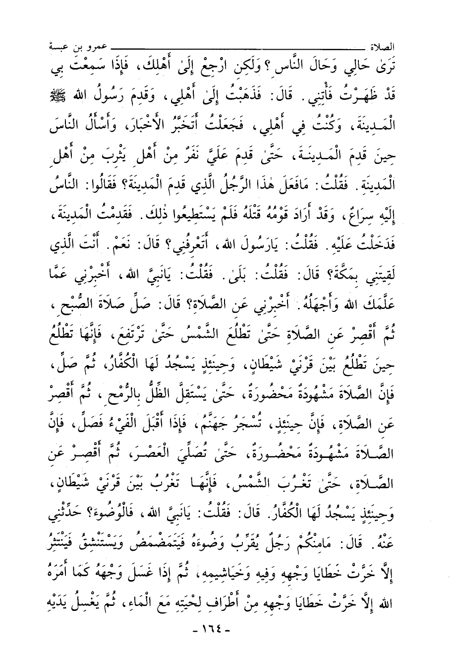 : يَا رَسُولَ اللهِ، أَتَعْرِفُنِي؟ قَالَ: نَعَمْ، أَنْتَ الَّذِي لَقِيتَنِي بِمَكَّةَ، قَالَ: فَقُلْتُ: بَلَى، فَقُلْتُ: يَا نَبيَّ اللهِ، أَخْبِرْنِي عَمَّا عَلَّمَكَ اللهُ وَأَجْهَلُهُ، أَخْبِرْنِي عَنِ الصَّلَاةِ؟ قَالَ: صَلِّ صَلَاةَ الصُّبْحِ، ثُمَّ أَقْصِرْ عَنِ الصَّلَاةِ، حَتَّى تَطْلُعَ الشَّمْسُ، حَتَّى تَرْتَفِعَ، فَإِنَّهَا تَطْلُعُ حِينَ تَطْلُعُ بَيْنَ قَرْنَيْ شَيْطَانٍ، وَحِينَئِذٍ يَسْجُدُ لَهَا الْكُفَّارُ، ثُمَّ صَلِّ، فَإِنَّ الصَّلَاةَ مَشْهُودَةٌ مَحْضُورَةٌ، حَتَّى يَسْتَقِلَّ الظِّلُّ بِالرُّمْحِ، ثُمَّ أَقْصِرْ عَنِ الصَّلَاةِ، فَإِنَّ حِينَئِذٍ تُسْجَرُ جَهَنَّمُ، فَإِذَا أَقْبَلَ الْفَيْءُ فَصَلِّ، فَإِنَّ الصَّلَاةَ مَشْهُودَةٌ مَحْضُورَةٌ، حَتَّى تُصَلِّيَ الْعَصْرَ، ثُمَّ أَقْصِرْ عَنِ الصَّلَاةِ، حَتَّى تَغْرُبَ الشَّمْسُ، فَإِنَّهَا تَغْرُبُ بَيْنَ قَرْنَيْ شَيْطَانٍ، وَحِينَئِذٍ يَسْجُدُ لَهَا الْكُفَّارُ، قَالَ: فَقُلْتُ: يَا نَبِيَّ اللهِ، فَالْوُضُوءُ حَدِّثْنِي عَنْهُ؟ قَالَ: مَا مِنْكُمْ رَجُلٌ يُقَرِّبُ وَضُوءَهُ، فَيَتَمَضْمَضُ وَيَسْتَنْشِقُ فَيَنْتَثِرُ، إِلَاّ خَرَّتْ خَطَايَا وَجْهِهِ وَفِيهِ وَخَيَاشِيمِهِ، ثُمَّ إِذَا غَسَلَ وَجْهَهُ كَمَا أَمَرَهُ اللهُ، إِلَاّ خَرَّتْ خَطَايَا وَجْهِهِ مِنْ أَطْرَافِ لِحْيَتِهِ مَعَ الْمَاءِ، ثُمَّ يَغْسِلُ يَدَيْهِ