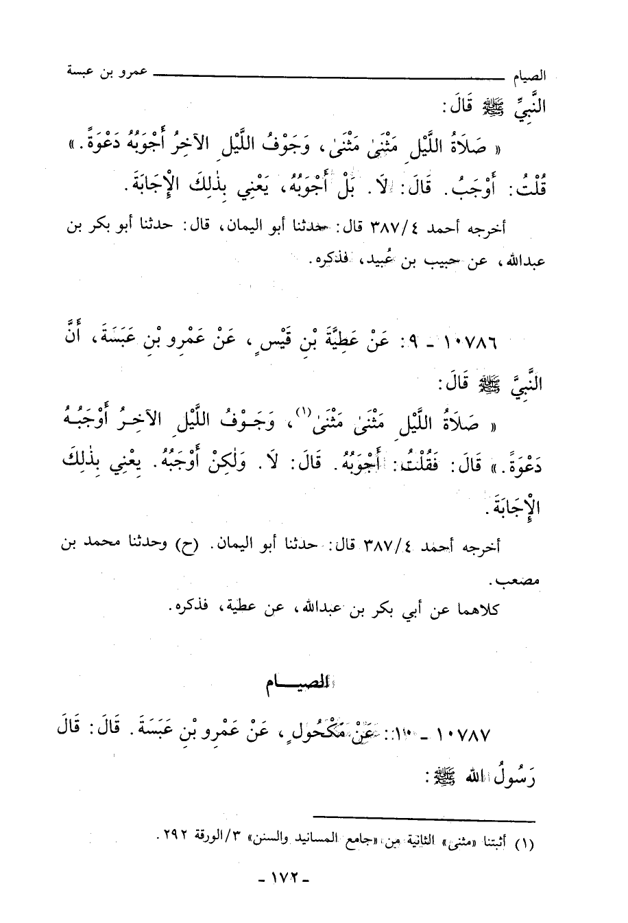 ١٠٧٨٦ - عَنْ عَطِيَّةَ بْنِ قَيْسٍ، عَنْ عَمْرِو بْنِ عَبَسَةَ، أَنَّ النَّبِيَّ صلى الله عليه وسلم قَالَ: