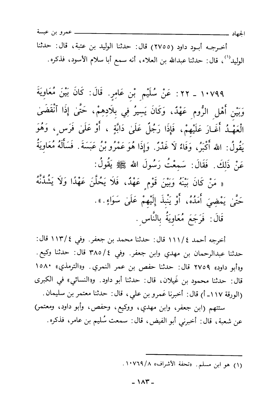 ١٠٧٩٩ - عَنْ سُلَيْمِ بْنِ عَامِرٍ، قَالَ: كَانَ بَيْنَ مُعَاوِيَةَ وَبَيْنَ أَهْلِ الرُّومِ عَهْدٌ، وَكَانَ يَسِيرُ فِي بِلَادِهِمْ، حَتَّى إِذَا انْقَضَى الْعَهْدُ، أَغَارَ عَلَيْهِمْ، فَإِذَا رَجُلٌ عَلَى دَابَّةٍ، أَوْ عَلَى فَرَسٍ، وَهُوَ يَقُولُ: اللهُ أَكْبَرُ، وَفَاءٌ لَا غَدْرٌ، وَإِذَا هُوَ عَمْرُو بْنُ عَبَسَةَ، فَسَأَلَهُ مُعَاوِيَةُ عَنْ ذَلِكَ؟ فَقَالَ: سَمِعْتُ رَسُولَ اللهِ صلى الله عليه وسلم يَقُولُ: