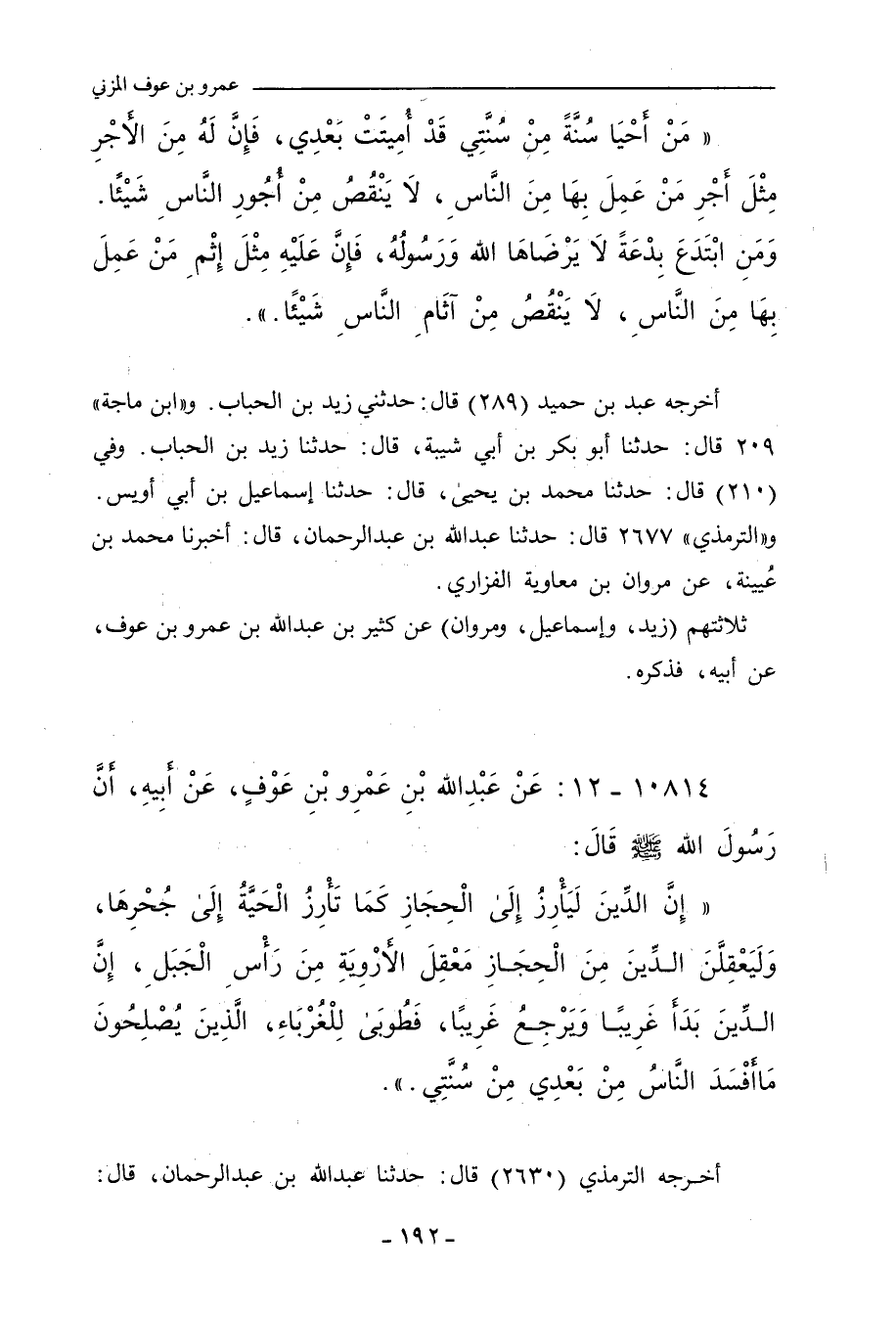 إِنَّ الدِّينَ لَيَأْرِزُ إِلَى الْحِجَازِ، كَمَا تَأْرِزُ الْحَيَّةُ إِلَى جُحْرِهَا، وَلَيَعْقِلَنَّ الدِّينَ مِنَ الْحِجَازِ مَعْقِلَ الأُرْوِيَّةِ مِنْ رَأْسِ الْجَبَلِ، إِنَّ الدِّينَ بَدَأَ غَرِيبًا وَيَرْجِعُ غَرِيبًا، فَطُوبَى لِلْغُرَبَاءِ، الَّذِينَ يُصْلِحُونَ مَا أَفْسَدَ النَّاسُ مِنْ بَعْدِي مِنْ سُنَّتِي.
