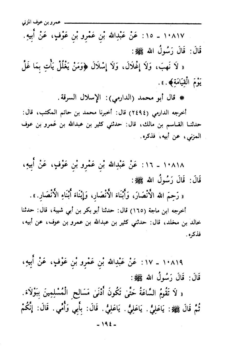 ١٠٨١٩ - عَنْ عَبْدِ اللهِ بْنِ عَمْرِو بْنِ عَوْفٍ، عَنْ أَبِيهِ، قَالَ: قَالَ رَسولُ اللهِ صلى الله عليه وسلم: