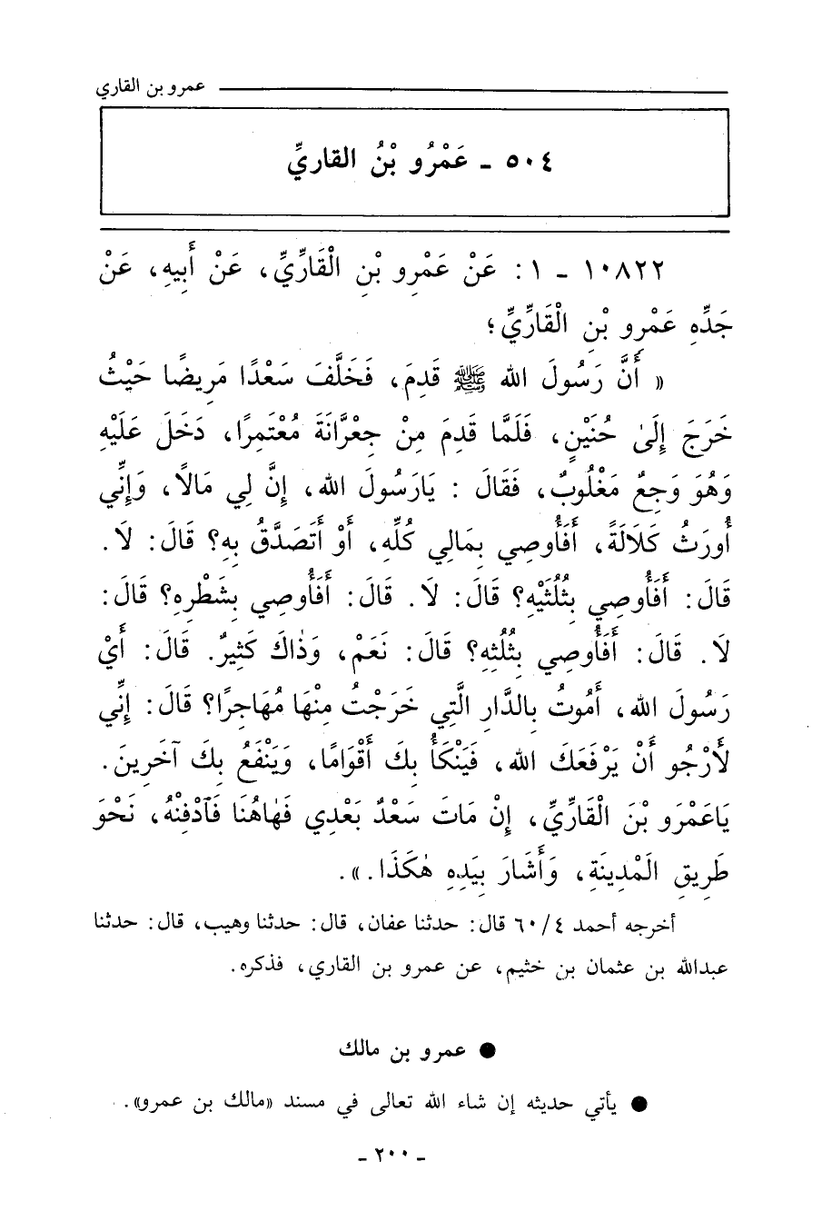 أَنَّ رَسُولَ اللهِ صلى الله عليه وسلم قَدِمَ، فَخَلَّفَ سَعْدًا مَرِيضًا، حَيْثُ خَرَجَ إِلَى حُنَيْنٍ، فَلَمَّا قَدِمَ مِنْ جِعِرَّانَةَ مُعْتَمِرًا، دَخَلَ عَلَيْهِ وَهُوَ وَجِعٌ مَغْلُوبٌ، فَقَالَ: يَا رَسُولَ اللهِ، إِنَّ لِي مَالاً، وَإِنِّي أُورَثُ كَلَالَةً، أَفَأُوصِي بِمَالِي كُلِّهِ، أَوْ أَتَصَدَّقُ بِهِ؟ قَالَ: لَا، قَالَ: أَفَأُوصِي بِثُلُثَيْهِ؟ قَالَ: لَا، قَالَ: أَفَأُوصِي بِشَطْرِهِ؟ قَالَ: لَا، قَالَ: أَفَأُوصِي بِثُلُثِهِ؟ قَالَ: نَعَمْ، وَذَاكَ كَثِيرٌ، قَالَ: أَيْ رَسُولَ اللهِ، أَمُوتُ بِالدَّارِ الَّتِي خَرَجْتُ مِنْهَا مُهَاجِرًا؟ قَالَ: إِنِّي لأَرْجُو أَنْ يَرْفَعَكَ اللهُ، فَيَنْكَأَ بِكَ أَقْوَامًا، وَيَنْفَعَ بِكَ آخَرِينَ، يَاعَمْرَو بْنَ الْقَارِيِّ، إِنْ مَاتَ سَعْدٌ بَعْدِي، فَهَا هُنَا فَادْفِنْهُ، نَحْوَ طَرِيقِ الْمَدِينَةِ، وَأَشَارَ بِيَدِهِ هَكَذَا.