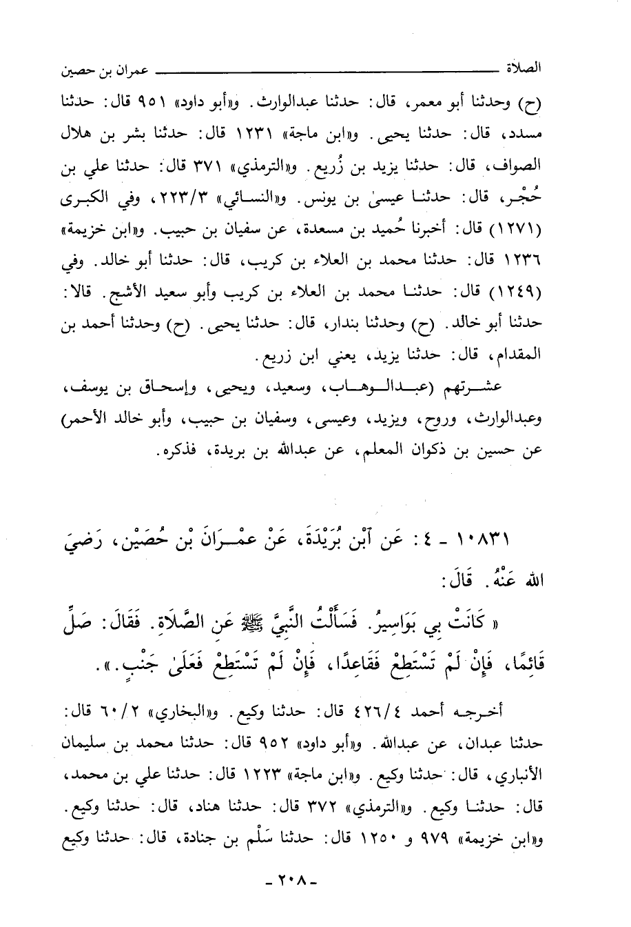 - وفي رواية: سَأَلْتُ رَسُولَ اللهِ صلى الله عليه وسلم عَنْ صَلَاةِ الْمَرِيضِ؟ فَقَالَ: صَلِّ قَائِمًا، فَإِنْ لَمْ تَسْتَطِعْ فَقَاعِدًا، فَإِنْ لَمْ تَسْتَطِعْ فَعَلَى جَنْبٍ. ت