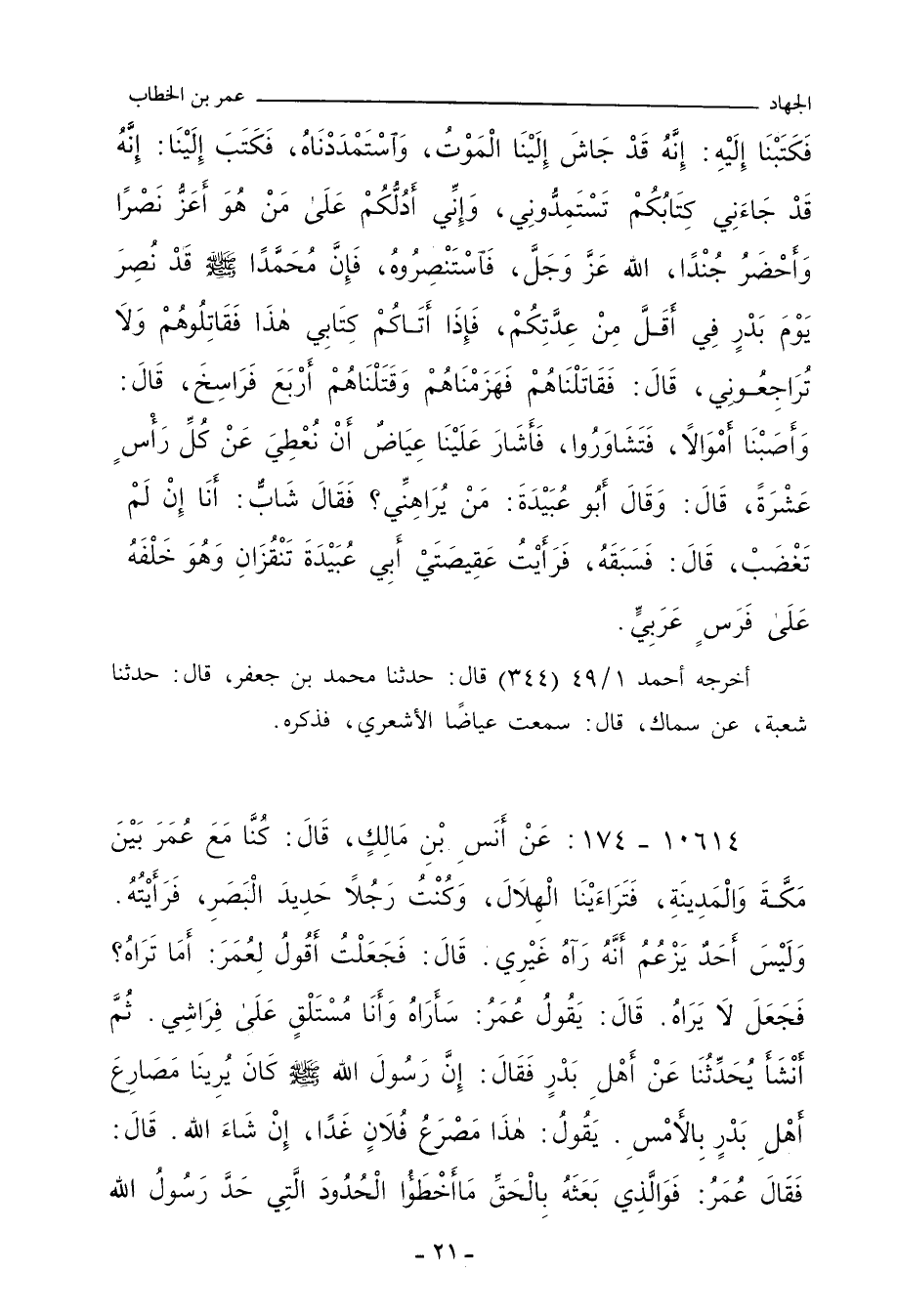فَكَتَبْنَا إِلَيْهِ: إِنَّهُ قَدْ جَاشَ إِلَيْنَا الْمَوْتُ، وَاسْتَمْدَدْنَاهُ، فَكَتَبَ إِلَيْنَا: إِنَّهُ قَدْ جَاءَنِي كِتَابُكُمْ تَسْتَمِدُّونِي، وَإِنِّي أَدُلُّكُمْ عَلَى مَنْ هُوَ أَعَزُّ نَصْرًا، وَأَحْضَرُ جُنْدًا، اللهُ، عَزَّ وَجَلَّ، فَاسْتَنْصِرُوهُ، فَإِنَّ مُحَمَّدًا صلى الله عليه وسلم قَدْ نُصِرَ يَوْمَ بَدْرٍ فِي أَقَلِّ مِنْ عِدَّتِكُمْ، فَإِذَا أَتَاكُمْ كِتَابِي هَذَا، فَقَاتِلُوهُمْ وَلَا تُرَاجِعُونِي، قَالَ: فَقَاتَلْنَاهُمْ، فَهَزَمْنَاهُمْ، وَقَتَلْنَاهُمْ أَرْبَعَ فَرَاسِخَ، قَالَ: وَأَصَبْنَا أَمْوَالاً، فَتَشَاوَرُوا، فَأَشَارَ عَلَيْنَا عِيَاضٌ أَنْ نُعْطِيَ عَنْ كُلِّ رَأْسٍ عَشْرَةً، قَالَ: وَقَالَ أَبُو عُبَيْدَةَ: مَنْ يُرَاهِنِّي؟ فَقَالَ شَابٌّ: أَنَا إِنْ لَمْ تَغْضَبْ، قَالَ: فَسَبَقَهُ، فَرَأَيْتُ عَقِيصَتَيْ أَبِي عُبَيْدَةَ تَنْقُزَانِ، وَهُوَ خَلْفَهُ، عَلَى فَرَسٍ عَرَبِيٍّ.