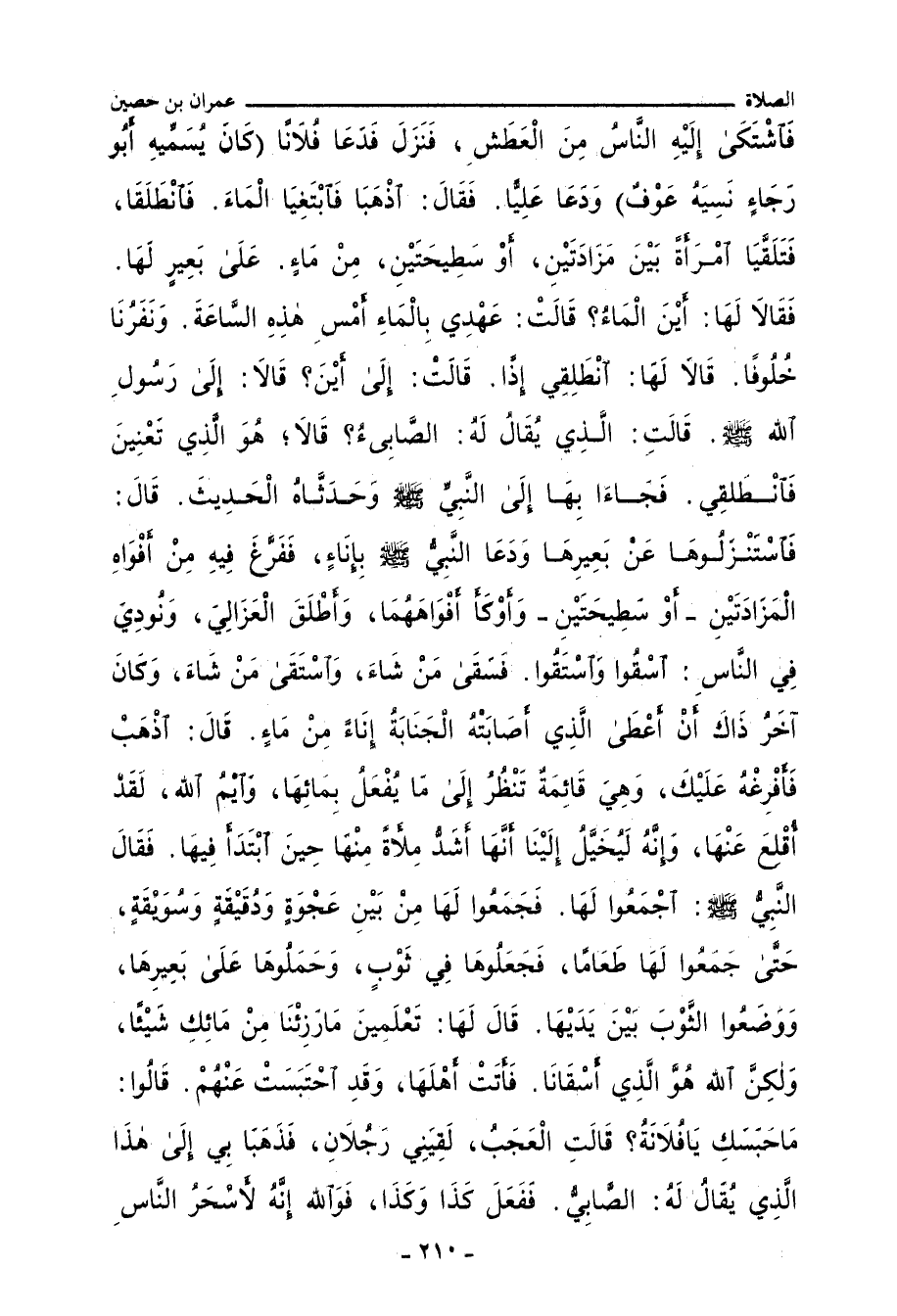 فَانْطَلَقَا، فَتَلَقَّيَا امْرَأَةً بَيْنَ مَزَادَتَيْنِ، أَوْ سَطِيحَتَيْنِ، مِنْ مَاءٍ عَلَى بَعِيرٍ لَهَا، فَقَالَا لَهَا: أَيْنَ الْمَاءُ؟ قَالَتْ: عَهْدِي بِالْمَاءِ أَمْسِ هَذِهِ السَّاعَةَ، وَنَفَرُنَا خُلُوفًا، قَالَا لَهَا: انْطَلِقِي إِذًا، قَالَتْ: إِلَى أَيْنَ؟ قَالَا: إِلَى رَسُولِ اللهِ صلى الله عليه وسلم، قَالَتِ: الَّذِي يُقَالُ لَهُ: الصَّابِئُ؟ قَالَا: هُوَ الَّذِي تَعْنِينَ، فَانْطَلِقِي، فَجَاءَا بِهَا إِلَى النَّبِيِّ صلى الله عليه وسلم، وَحَدَّثَاهُ الْحَدِيثَ، قَالَ: فَاسْتَنْزَلُوهَا عَنْ بَعِيرِهَا، وَدَعَا النَّبِيُّ صلى الله عليه وسلم بِإِنَاءٍ، فَفَرَّغَ فِيهِ مِنْ أَفْوَاهِ الْمَزَادَتَيْنِ، أَوِ السَّطِيحَتَيْنِ، وَأَوْكَأَ أَفْوَاهَهُمَا، وَأَطْلَقَ الْعَزَالِيَ، وَنُودِيَ فِي النَّاسِ: اسْقُوا وَاسْتَقُوا، فَسَقَى مَنْ شَاءَ، وَاسْتَقَى مَنْ شَاءَ، وَكَانَ آخِرَُ ذَاكَ أَنْ أَعْطَى الَّذِي أَصَابَتْهُ الْجَنَابَةُ إِنَاءً مِنْ مَاءٍ، قَالَ: اذْهَبْ، فَأَفْرِغْهُ عَلَيْكَ، وَهِْيَ قَائِمَةٌ تَنْظُرُ إِلَى مَا يُفْعَلُ بِمَائِهَا، وَايْمُ اللهِ، لَقَدْ أُقْلِعَ عَنْهَا، وَإِنَّهُ لَيُخَيَّلُ إِلَيْنَا أَنَّهَا أَشَدُّ مِلأَةً مِنْهَا حِينَ ابْتَدَأَ فِيهَا، فَقَالَ النَّبِيُّ صلى الله عليه وسلم: اجْمَعُوا لَهَا، فَجَمَعُوا لَهَا مِنْ بَيْنِ عَجْوَةٍ وَدَقِيقَةٍ وَسَوِيقَةٍ، حَتَّى جَمَعُوا لَهَا طَعَامًا، فَجَعَلُوهَا فِي ثَوْبٍ، وَحَمَلُوهَا عَلَى بَعِيرِهَا، وَوَضَعُوا الثَّوْبَ بَيْنَ يَدَيْهَا، قَالَ لَهَا: تَعْلَمِينَ، مَا رَزِئْنَا مِنْ مَائِكِ شَيْئًا، وَلَكِنَّ اللهَ هُوَ الَّذِي أَسْقَانَا، فَأَتَتْ أَهْلَهَا، وَقَدِ احْتَبَسَتْ عَنْهُمْ، قَالُوا: مَا حَبَسَكِ يَا فُلَانَةُ؟