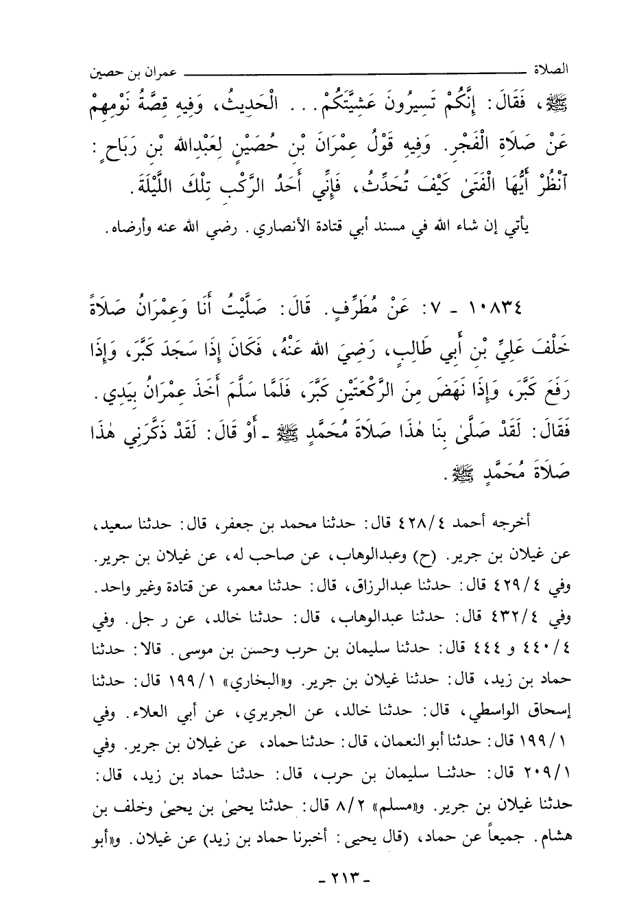 - وفي رواية: عَنْ مُطَرِّفِ بْنِ الشِّخِّيرِ، عَنْ عِمْرَانَ بْنِ حُصَيْنٍ، قَالَ: صَلَّيْتُ خَلْفَ عَلِيِّ بْنِ أَبِي طَالِبٍ، رَضِيَ اللهُ عَنْهُ، صَلَاةً، ذَكَّرَنِي صَلَاةً صَلَّيْتُهَا مَعَ رَسُولِ اللهِ صلى الله عليه وسلم، وَالْخَلِيفَتَيْنِ، قَالَ: فَانْطَلَقْتُ فَصَلَّيْتُ مَعَهُ، فَإِذَا هُوَ يُكَبِّرُ كُلَّمَا سَجَدَ، وَكُلَّمَا رَفَعَ رَأْسَهُ مِنَ الرُّكُوعِ.