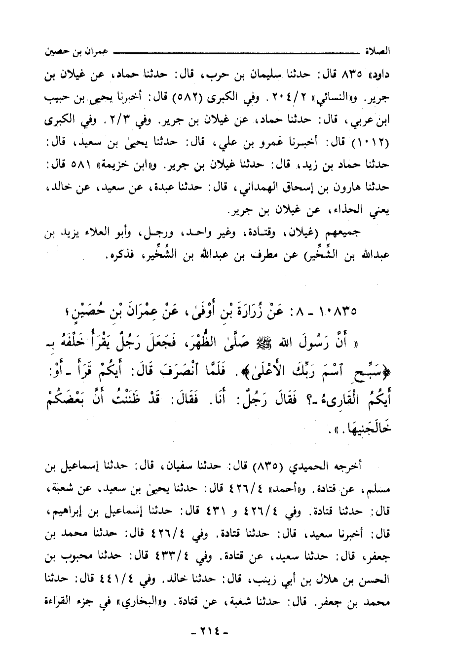 داود"٨٣٥ قال: حدَّثنا سُلَيْمان بن حَرْب، حدَّثنا حَمَّاد، عن غَيْلان بن جَرِير. و"النَّسائي"٢/ ٢٠٤، وفي "الكبرى"٦٧٣ قال: أَخْبَرنا يَحيى بن حَبِيب بن عَرَبِي، قال: حدَّثنا حَمَّاد، عن غَيْلان بن جَرِير. وفي ٣/ ٢، وفي "الكبرى"١١٠٤ قال: أَخْبَرنا عَمْرو بن علي، قال: حدَّثنا يَحيى بن سَعِيد، قال: حدَّثنا حَمَّاد بن زَيْد، قال: حدَّثنا غَيْلان بن جَرِير. و"ابن خزيمة"٥٨١ قال: حدَّثنا هارون بن إِسْحاق الهَمْدَانِي، قال: حدَّثنا عَبْدَة، عن سَعِيد، عن خالد، يَعْنِي الحَذَّاء، عن غَيْلان بن جَرِير.