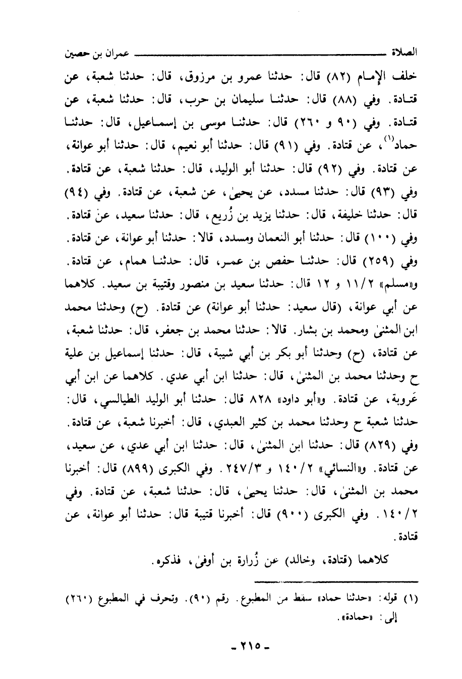 ٨٢ قال: حدَّثنا عَمْرو بن مَرْزُوق، قال: حدَّثنا شُعْبة، عن قَتَادَة. وفي (٨٨) قال: حدَّثنا سُلَيْمان بن حَرْب، قال: حدَّثنا شُعْبة، عن قَتَادَة. وفي (٩٠ و ٢٦٠) قال: حدَّثنا مُوسَى بن إِسْمَاعِيل، قال: حدَّثنا حَمَّاد، عن قَتَادَة. وفي (٩١) قال: حدَّثنا أبو نُعَيْم، قال: حدَّثنا أبو عَوَانَة، عن قَتَادَة. وفي (٩٢) قال: حدَّثنا أبو الوَلِيد، قال: حدَّثنا شُعْبة، عن قَتَادَة. وفي (٩٣) قال: حدَّثنا مُسَدَّد، عن يَحيى، عن شُعْبة، عن قَتَادَة. وفي (٩٤) قال: حدَّثنا خَلِيفَة، قال: حدَّثنا يَزِيد بن زُرَيْع، قال: حدَّثنا سَعِيد، عن قَتَادَة. وفي (١٠٠) قال: حدَّثنا أبو النُّعْمان، ومُسَدَّد، قالا: حدَّثنا أبو عَوَانَة، عن قَتَادَة. وفي (٢٥٩) قال: حدَّثنا حَفْص بن عُمَر، قال: حدَّثنا هَمَّام، عن قَتَادَة. و"مسلم"٢/ ١١ (٨١٦) قال: حدَّثنا سَعِيد بن مَنْصُور، وقُتَيْبَة بن سَعِيد، كلاهما عن أَبي عَوَانَة، قال سَعِيد: حدَّثنا أبو عَوَانَة، عن قَتَادَة. وفي (٨١٧) قال: حدَّثنا مُحَمد بن المُثَنَّى، ومُحَمد بن بَشَّار، قالا: حدَّثنا مُحَمد بن جَعْفَر، حدَّثنا شُعْبة،