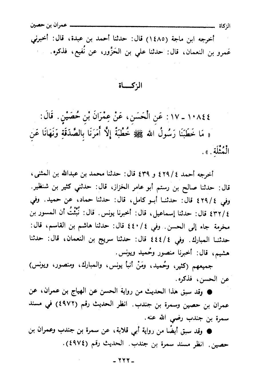 - وفي رواية: مَا قَامَ فِينَا رَسُولُ اللهِ صلى الله عليه وسلم خَطِيبًا إِلَاّ أَمَرَنَا بِالصَّدَقَةِ، وَنَهَانَا عَنِ الْمُثْلَةِ، قَالَ: وَقَالَ: أَلَا وَإِنَّ مِنَ الْمُثْلَةِ أَنْ يَنْذُرَ الرَّجُلُ أَنْ يَخْرِمَ أَنْفَهُ، أَلَا وَإِنَّ مِنَ الْمُثْلَةِ أَنْ يَنْذُرَ الرَّجُلُ أَنْ يَحُجَّ مَاشِيًا، فَلْيُهْدِ هَدْيًا وَلْيَرْكَبْ (٢٠٠٩٧)